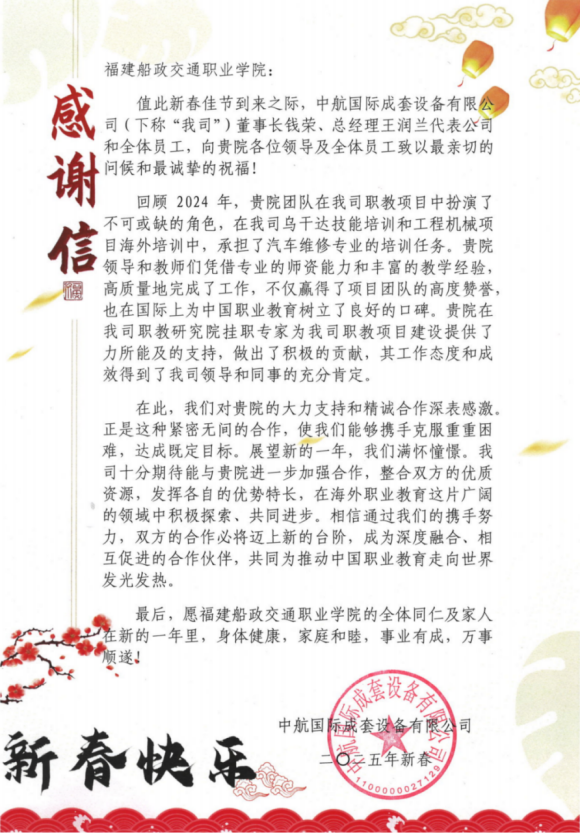 近日,中航國際成套設(shè)備有限公司向我院發(fā)來新春感謝信,對學(xué)院2024年烏干達職教項目師資團隊和掛職專家的卓越貢獻表示高度認(rèn)可和誠摯感謝,并對全體師生致以新春祝福。