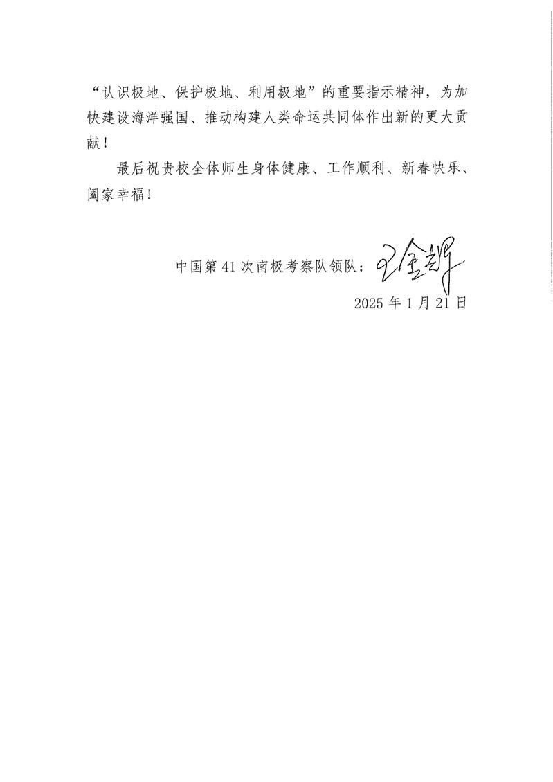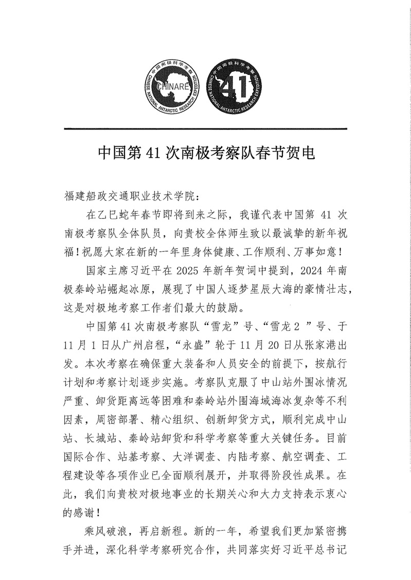 近日,遠在南極執(zhí)行科學(xué)考察任務(wù)的中國第41次南極考察隊向我院發(fā)來春節(jié)賀電,感謝我院對極地事業(yè)的長期關(guān)心和大力支持,并向全院師生致以誠摯的節(jié)日問候!