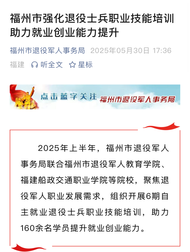 2025年上半年,福州市退役軍人事務(wù)局聯(lián)合福州市退役軍人教育學(xué)院、福建船政交通職業(yè)學(xué)院等院校,聚焦退役軍人職業(yè)發(fā)展需求,組織開展6期自主就業(yè)退役士兵職業(yè)技能培訓(xùn),助力160余名學(xué)員提升就業(yè)創(chuàng)業(yè)能力。