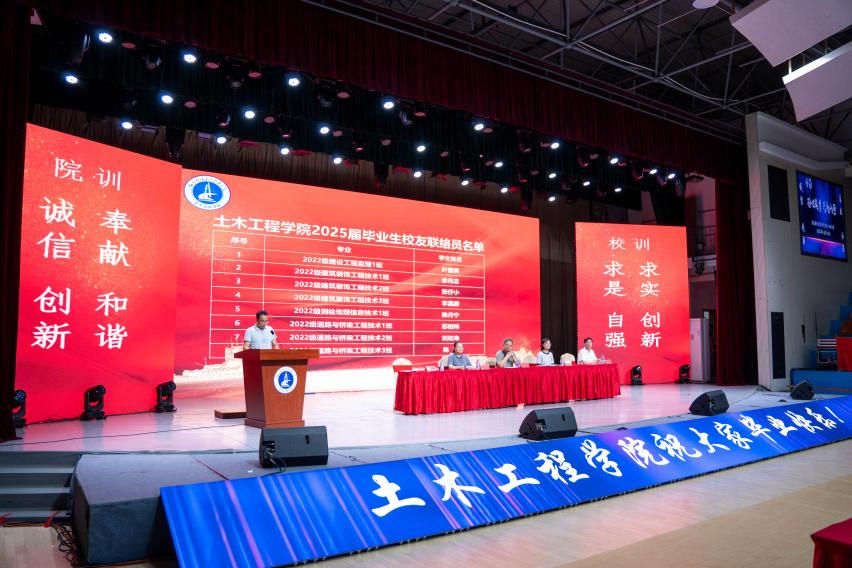 2025年6月10日,土木工程學(xué)院在福道園文體中心隆重舉行2025屆畢業(yè)生畢業(yè)典禮。作為典禮重要環(huán)節(jié),土木工程專業(yè)委員會(huì)正式聘任22名2025屆畢業(yè)生擔(dān)任校友聯(lián)絡(luò)員,建立校友與母校的常態(tài)化聯(lián)絡(luò)機(jī)制。學(xué)院黨總支書(shū)記高杰、院長(zhǎng)黃穎等領(lǐng)導(dǎo)班子成員、部分教師代表及2025屆全體畢業(yè)生共同見(jiàn)證這一重要時(shí)刻。