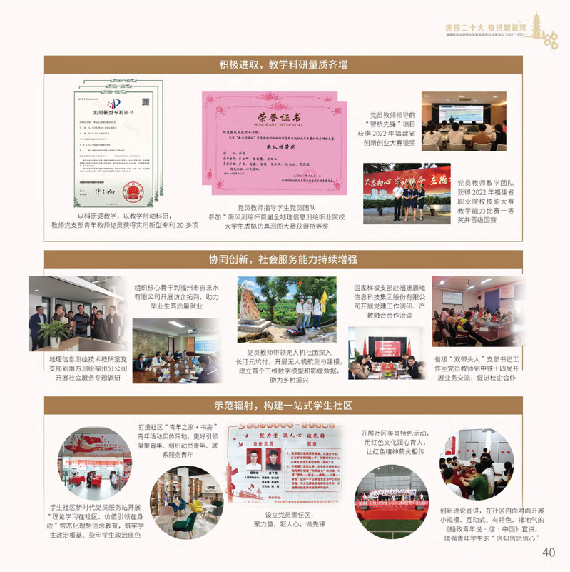 十九大以來,福建船政交通職業(yè)學(xué)院堅(jiān)持以習(xí)近平新時(shí)代中國特色社會(huì)主義思想為指導(dǎo),堅(jiān)持社會(huì)主義辦學(xué)方向,深入貫徹黨的十九大和十九屆歷次全會(huì)精神,堅(jiān)守“為黨育人、為國育才”的初心和使命,慎終如始推進(jìn)學(xué)校黨的政治建設(shè)、思想建設(shè)、組織建設(shè)、作風(fēng)建設(shè)、紀(jì)律建設(shè)、制度建設(shè),黨的組織體系和學(xué)校治理體系相得益彰,黨建引領(lǐng)推動(dòng)創(chuàng)新船政、質(zhì)量船政、文化船政協(xié)奏齊鳴,政治生態(tài)、學(xué)術(shù)生態(tài)、文化生態(tài)持續(xù)向好,辦學(xué)效率、辦學(xué)效能、辦學(xué)效益顯著提升!