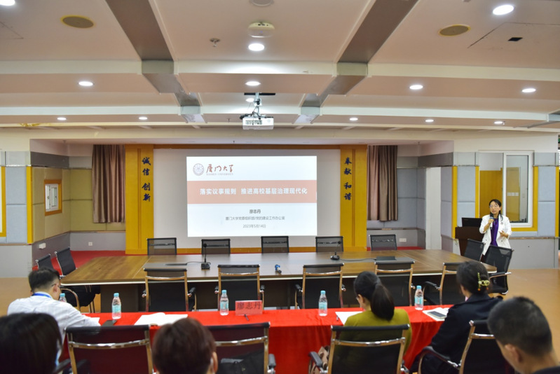 會議邀請了廈門大學黨建辦主任、組織部副部長廖志丹做了《落實議事規(guī)則 推進高校基層治理現(xiàn)代化》專題輔導報告會。廖主任結合專項檢查、現(xiàn)場推進會以及在廈門大學開展的議事規(guī)則調研等所發(fā)現(xiàn)的問題,從解讀《中國共產黨普通高等學校基層組織工作條例》入手,對如何進一步規(guī)范二級學院領導班子權力運行和決策機制做了詳細的專題輔導。