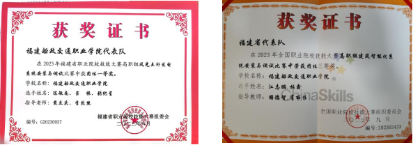 圖4 2023福建省職業(yè)技能大賽高職組風(fēng)光互補(bǔ)發(fā)電系統(tǒng)安裝與調(diào)試團(tuán)體一等獎及2023年全國職業(yè)院校高職組建筑智能化系統(tǒng)安裝與調(diào)試三等獎