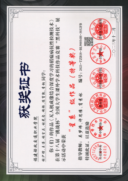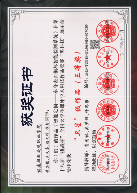 黨員教師率先垂范,帶領(lǐng)學(xué)生奮勇爭先,扎根農(nóng)田,把科研成果寫在祖國的大地上,發(fā)揮科創(chuàng)育人作用,激勵廣大青年勤奮學(xué)習(xí),大膽實(shí)踐,勇于創(chuàng)新,以賽促學(xué),以賽促教,以賽促創(chuàng),由肖秀林,許思維,吳夢煒老師所帶領(lǐng)“無人機(jī)成像結(jié)合深度學(xué)習(xí)的稻瘟病抗性檢測技術(shù)”團(tuán)隊榮獲第十八屆挑戰(zhàn)杯全國大學(xué)生課外學(xué)術(shù)科技作品競賽黑科技專項賽星際級特等獎,實(shí)現(xiàn)校級在該獎項的零突破,“智能定損車身表面損壞智能檢測系統(tǒng)”團(tuán)隊榮獲第十八屆挑戰(zhàn)杯全國大學(xué)生課外學(xué)術(shù)科技作品競賽黑科技專項賽衛(wèi)星級三等獎。由戴立慶、李烈熊帶領(lǐng)的團(tuán)隊在福建省職業(yè)技能大賽高職組風(fēng)光互補(bǔ)發(fā)電系統(tǒng)安裝與調(diào)試團(tuán)體一等獎,由游德智、肖麗佳帶領(lǐng)的團(tuán)隊獲2023年全國職業(yè)院校高職組建筑智能化系統(tǒng)安裝與調(diào)試三等獎。