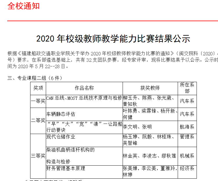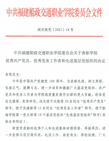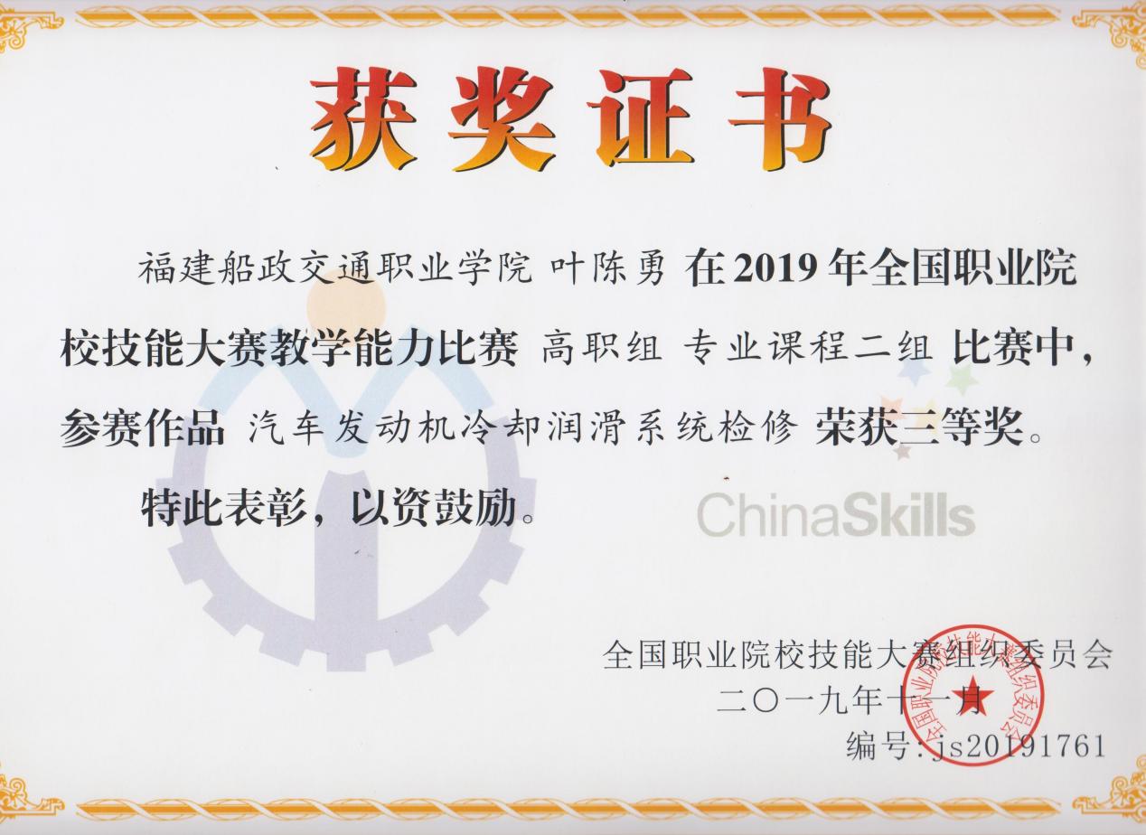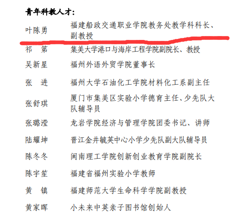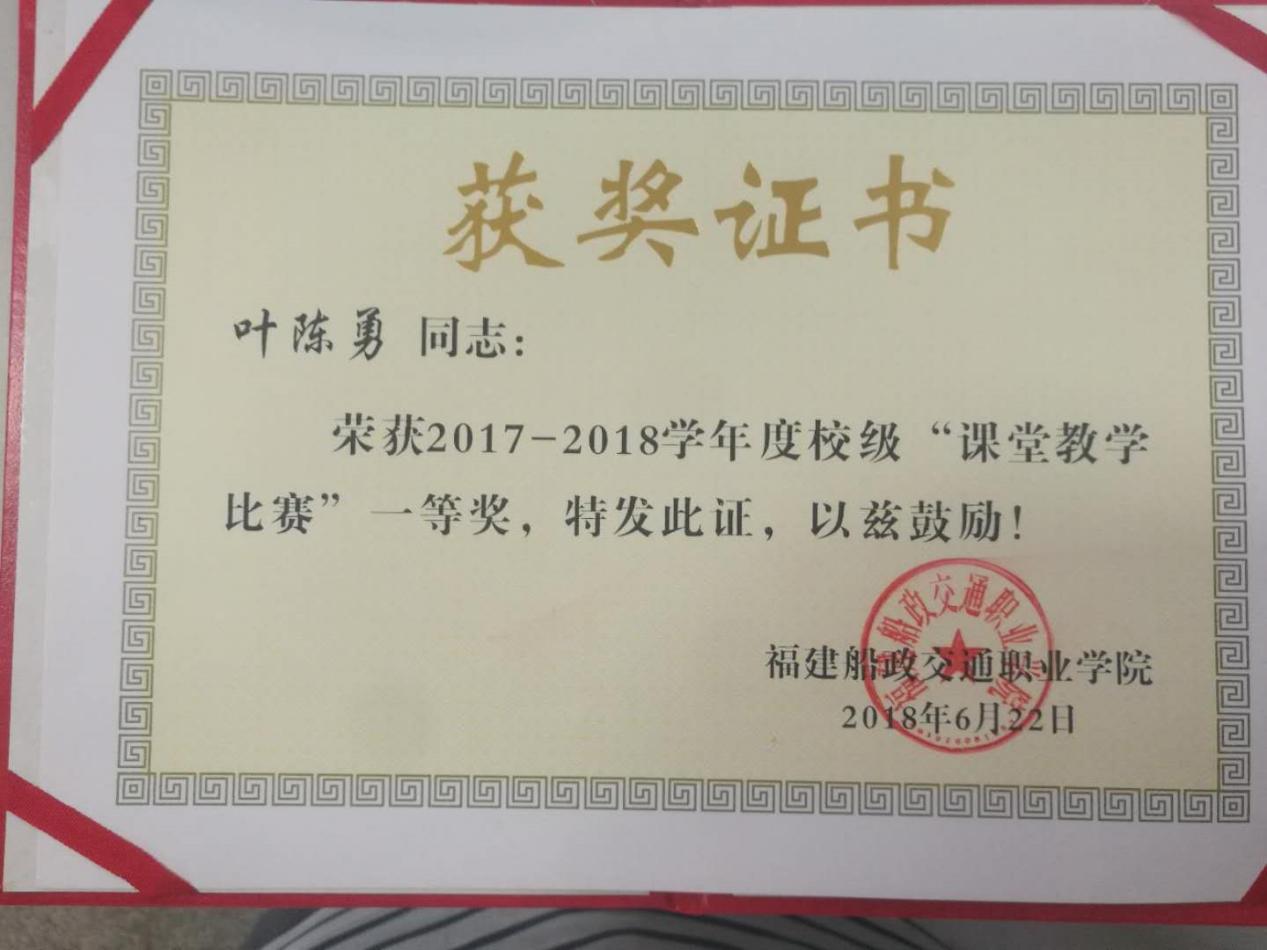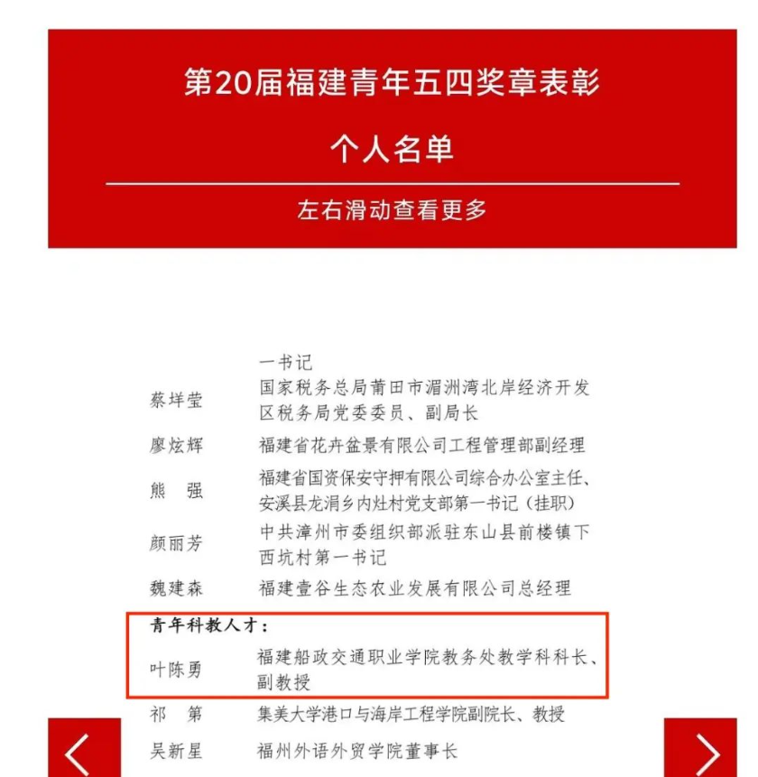葉陳勇,福建船政交通職業(yè)學(xué)院教務(wù)處黨支部,男,1987年12月出生,2007年12月入黨,現(xiàn)任福建船政交通職業(yè)學(xué)院教務(wù)處教學(xué)科科長(zhǎng)(副教授)。曾擔(dān)任汽車制造與裝配技術(shù)專業(yè)負(fù)責(zé)人,分赴加蓬共和國(guó)援教、中國(guó)教育會(huì)計(jì)學(xué)會(huì)高等職業(yè)院校分會(huì)掛職。曾獲加蓬共和國(guó)國(guó)家嘉獎(jiǎng)狀,福建省第20屆五四青年獎(jiǎng),“最美逆行者”,全國(guó)職業(yè)院校教師教學(xué)能力比賽二等獎(jiǎng)、三等獎(jiǎng),省教師教學(xué)能力比賽一等獎(jiǎng)、二等獎(jiǎng),省技能大賽一等獎(jiǎng)指導(dǎo)教師,建黨100周年之際校優(yōu)秀共產(chǎn)黨員,校首屆五四青年獎(jiǎng),校優(yōu)秀教師,校優(yōu)秀教育工作者,校級(jí)教學(xué)成果獎(jiǎng)一二等獎(jiǎng)等。