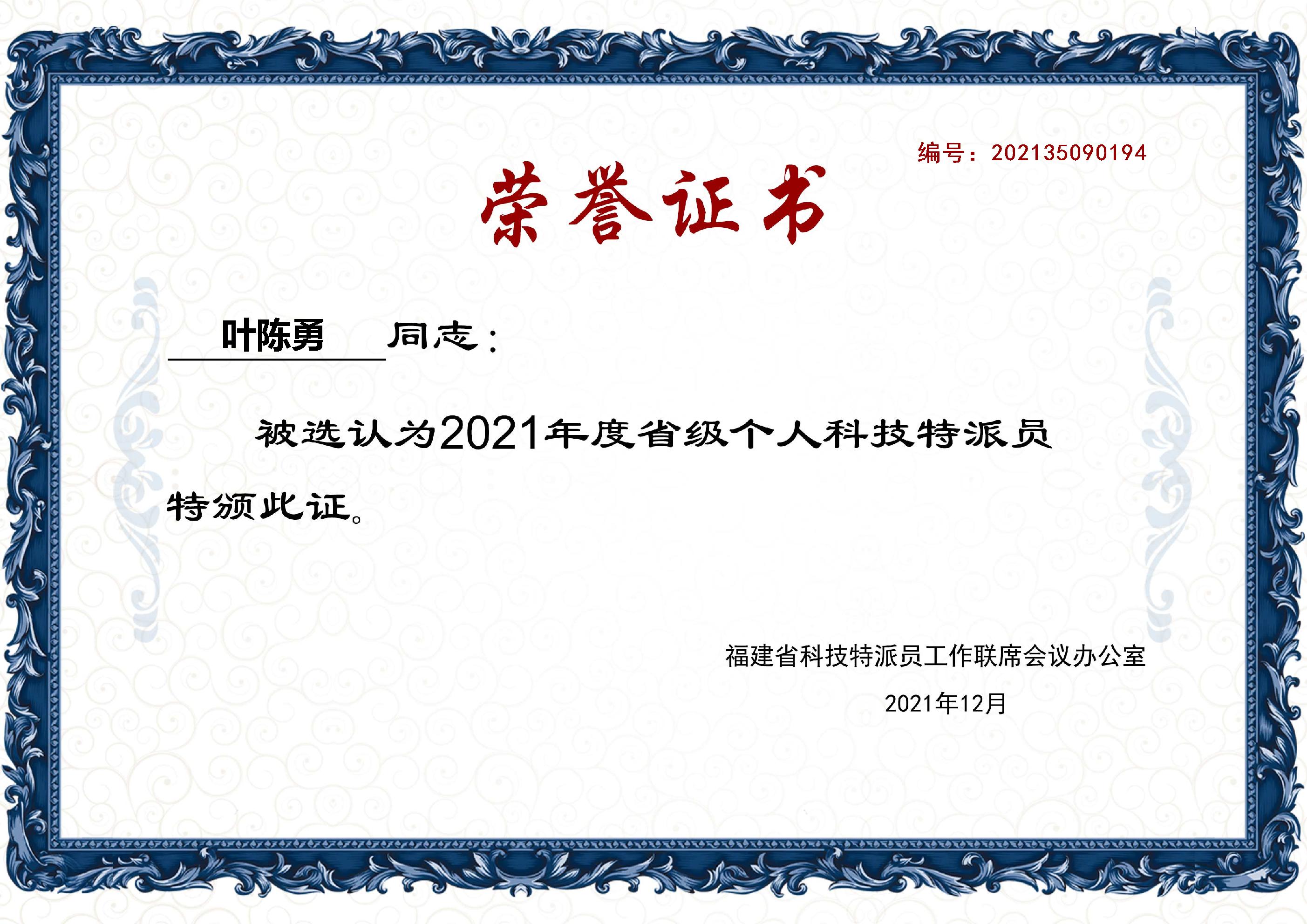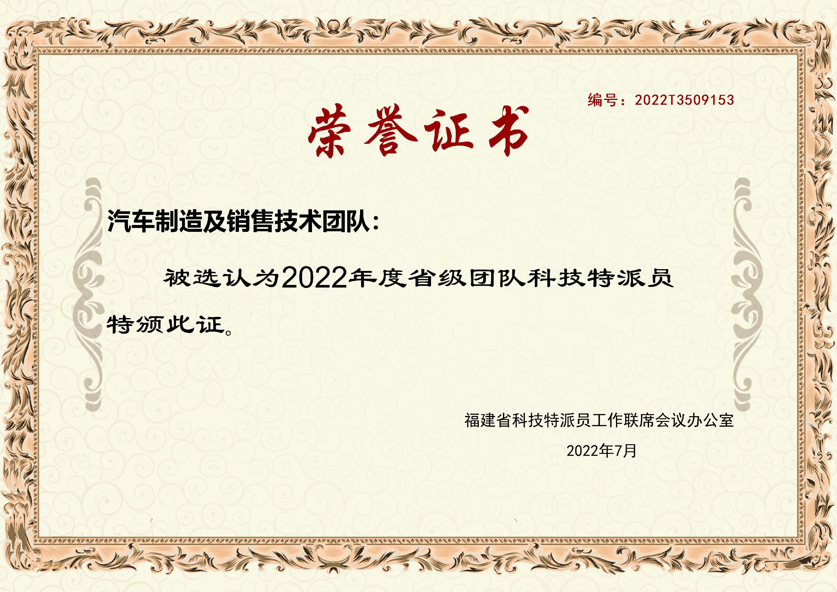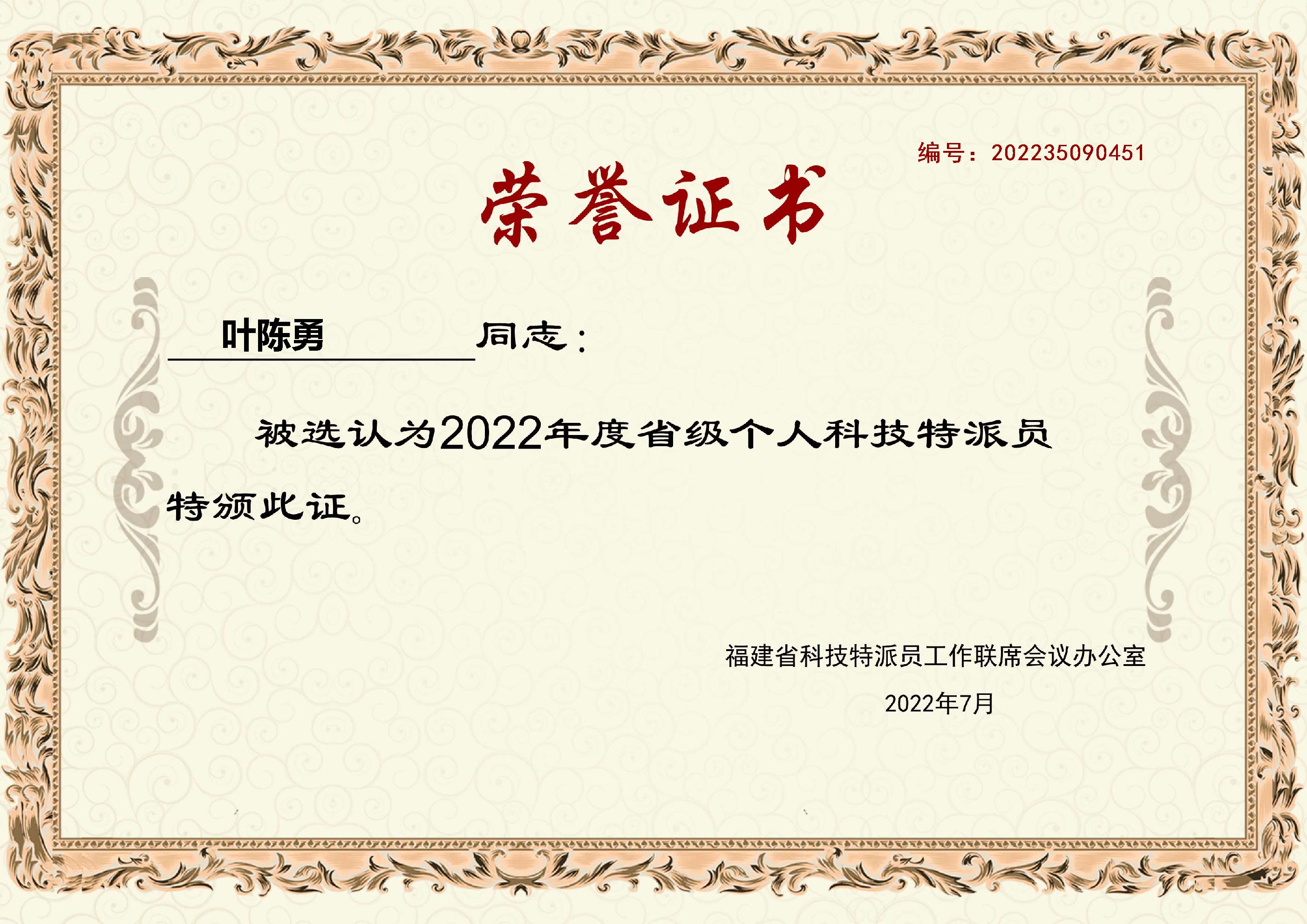(五)2021年12月、2022年7月被福建省科技特派員工作聯(lián)席會(huì)議辦公室(福建省科學(xué)技術(shù)廳)選任為個(gè)人科技特派員、團(tuán)隊(duì)科技特派員