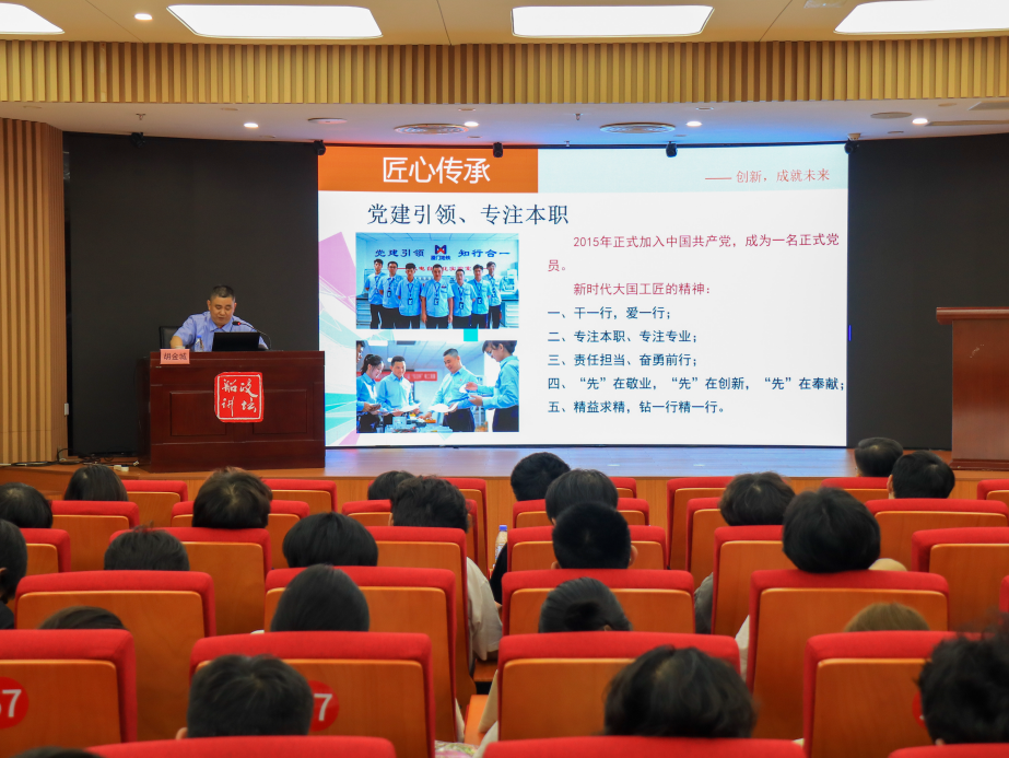 講座中,胡金城以質(zhì)樸的語言回顧了自己從安溪陳利職校電子電器專業(yè)學(xué)生成長為行業(yè)技術(shù)領(lǐng)軍人物的奮斗歷程。30年前,他懷揣著對技術(shù)的熱愛,從家電維修工起步,歷經(jīng)電子公司創(chuàng)業(yè)者、船舶重工電氣專家、地鐵高級(jí)技師等多重身份轉(zhuǎn)變。作為廈門地鐵高級(jí)技術(shù)人員,胡金城結(jié)合廈門地鐵智能照明系統(tǒng)改造、通風(fēng)空調(diào)節(jié)能技改等案例,生動(dòng)詮釋了“創(chuàng)新始于堅(jiān)守”的工匠精神。他帶領(lǐng)團(tuán)隊(duì)研發(fā)的“一鍵開關(guān)站”項(xiàng)目榮獲全國發(fā)明展覽會(huì)金獎(jiǎng),智能照明系統(tǒng)改造累計(jì)節(jié)約成本超60萬元,并獲得國家實(shí)用新型專利。他的故事生動(dòng)詮釋了“干一行愛一行,鉆一行精一行”的工匠精神內(nèi)涵。同時(shí),他也分享了自己作為黨員和工匠的雙重身份,如何在工作中發(fā)揮先鋒模范作用,傳承和弘揚(yáng)工匠精神,培養(yǎng)出一批又一批優(yōu)秀的技術(shù)人才。