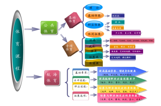 《體育與健康》課程按模塊化設置,為不同專業(yè)學生參加技能大賽奠定良好的身體基礎。公共體育開設兩年設《基礎體育》和《專項體育》。一年級為《基礎體育》模塊,設理論部分、基礎體能、職業(yè)體育和拓展選項教學四個部分;二年級開設16門專項選項課程,學生自主選項。航海體育課程按模塊設基礎素質、水中技能、職業(yè)技能、拓展選項四個模塊進行教學。