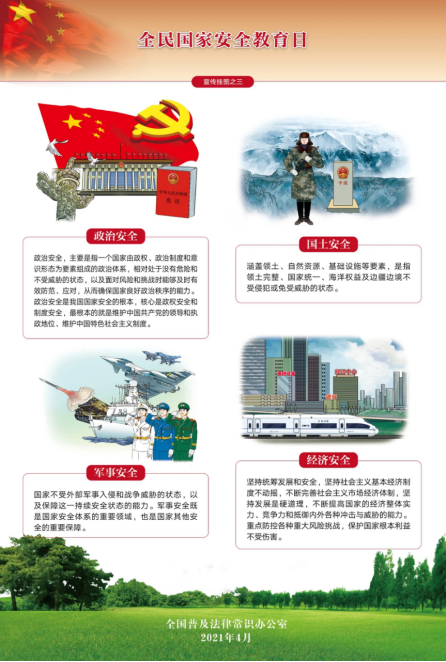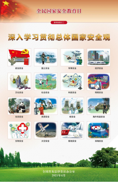 什么是全民國家安全教育日? 全民國家安全教育日(National Security Education Day),是為了增強全民國家安全意識,維護國家安全而設立的節(jié)日。2015年7月1日,全國人大常委會通過的《中華人民共和國國家安全法》第十四條規(guī)定,每年4月15日為全民國家安全教育日。 什么是國家安全? 根據(jù)《國家安全法》第二條規(guī)定: 國家安全是指國家政權、主權、統(tǒng)一和領土完整、人民福祉、經(jīng)濟社會可持續(xù)發(fā)展和國家其他重大利益相對處于沒有危險和不受內外威脅的狀態(tài),以及保障持續(xù)安全狀態(tài)的能力。 什么是堅持總體國家安全觀 2014年4月15日,習近平總書記在中央國家安全委員會第一次全體會議上提出,堅持總體國家安全觀,走出一條中國特色國家安全道路。首次提出總體國家安全觀重大戰(zhàn)略思想。這是以習近平同志為核心的黨中央對國家安全理論的重大創(chuàng)新,是新形勢下維護和塑造中國特色國家安全的行動指南,具有重大的理論意義、時代意義、實踐意義。 總體國家安全觀的五大要素 1.以人民安全為宗旨 2.以政治安全為根本 3.以經(jīng)濟安全為基礎 4.以軍事、文化、社會安全為保障 5.以促進國際安全為依託 貫徹落實總體國家安全觀,做到十個重視(五對關系) 1.既重視外部安全、又重視內部安全 2.既重視國土安全、又重視國民安全 3.既重視傳統(tǒng)安全、又重視非傳統(tǒng)安全 4.既重視發(fā)展問題、又重視安全問題 5.既重視自身安全、又重視共同安全