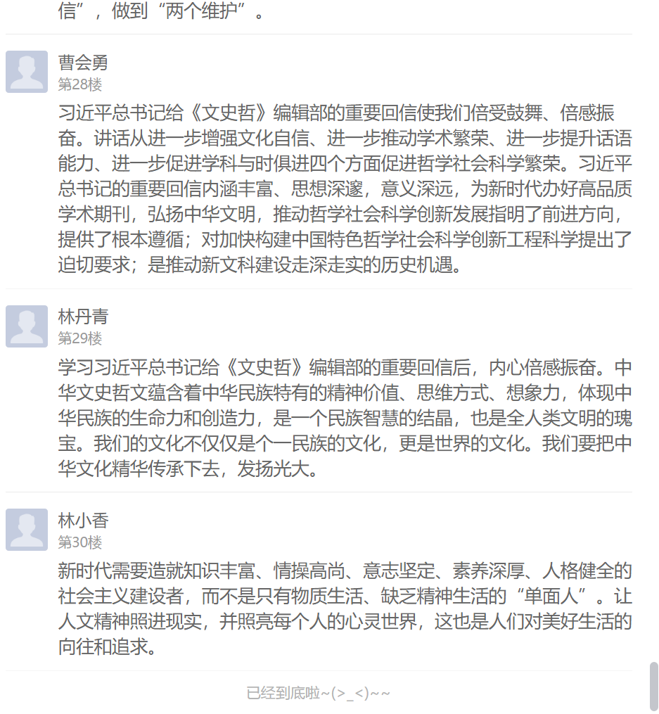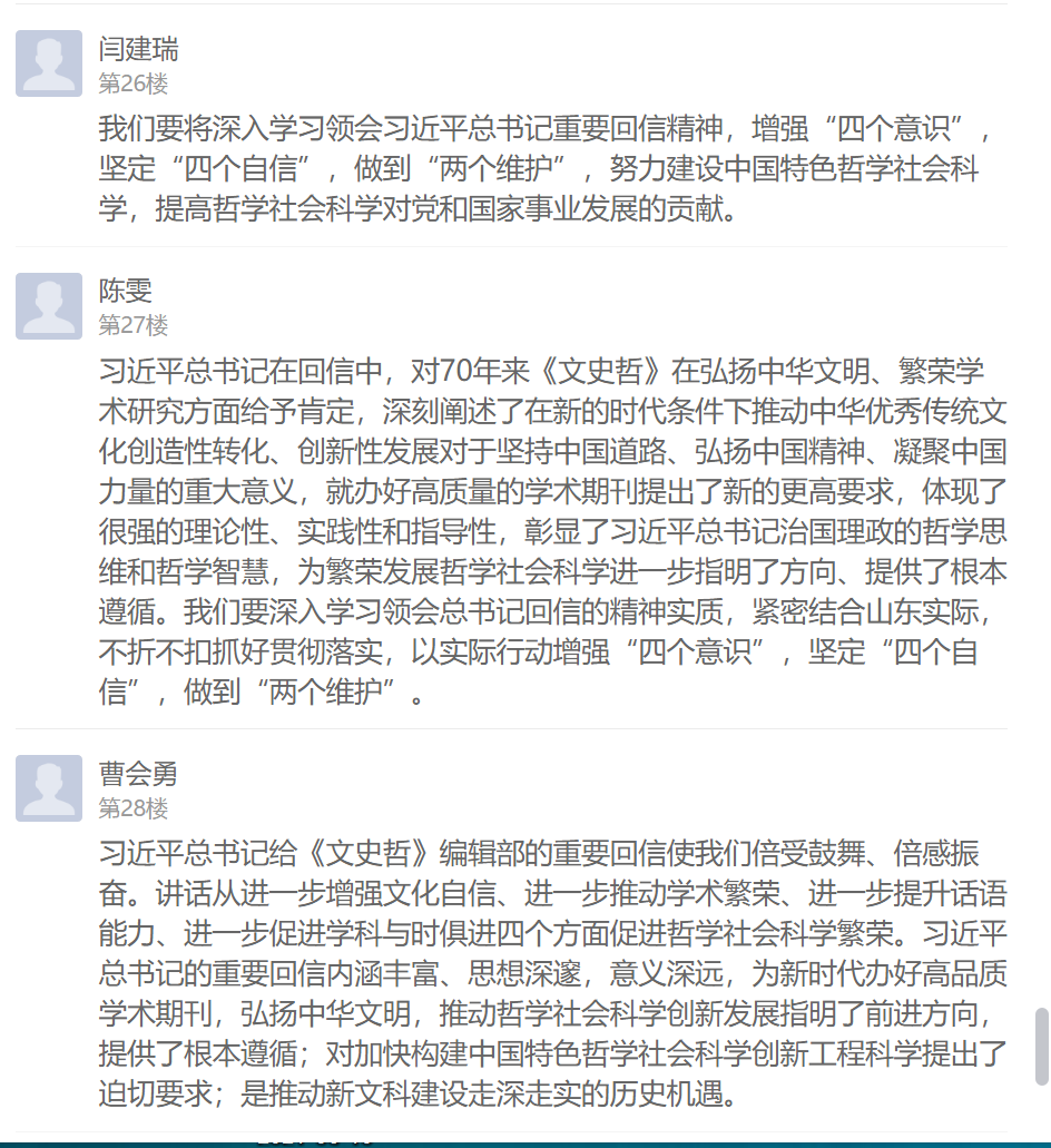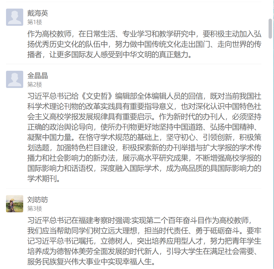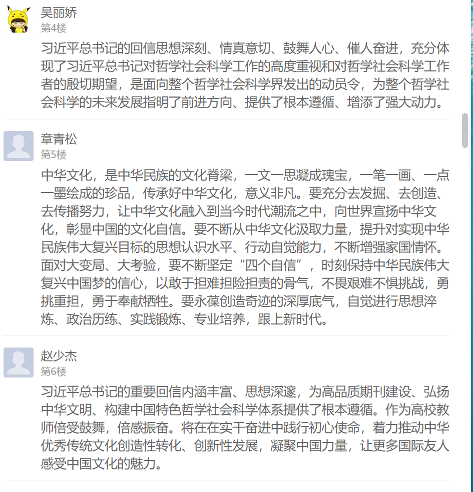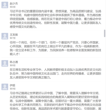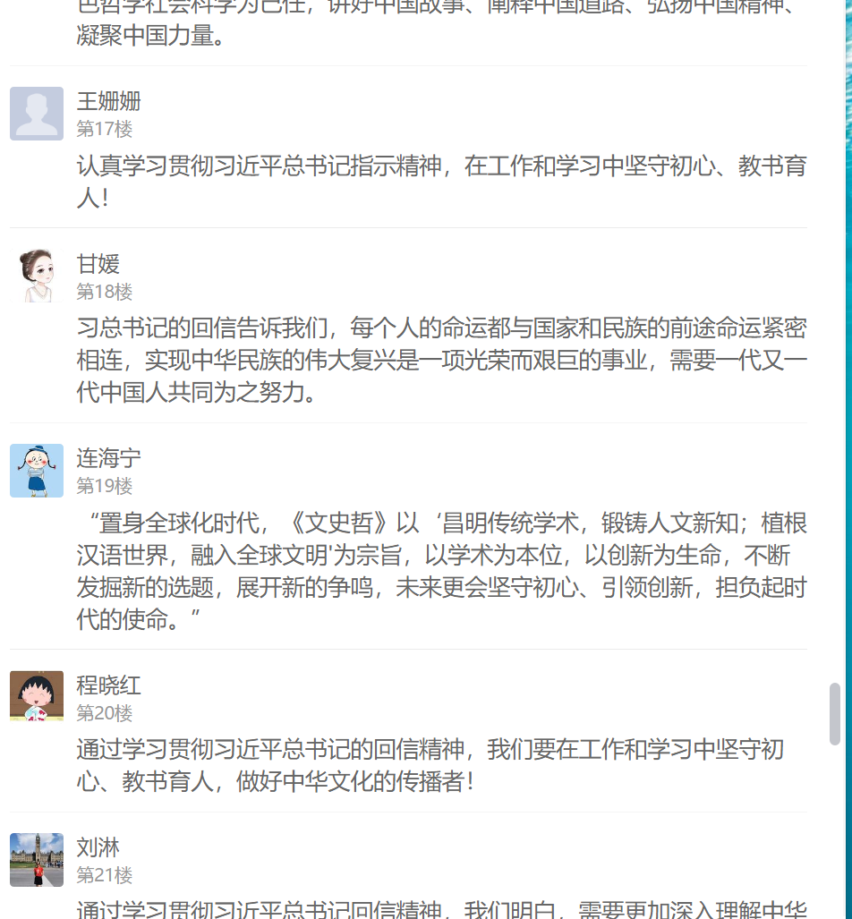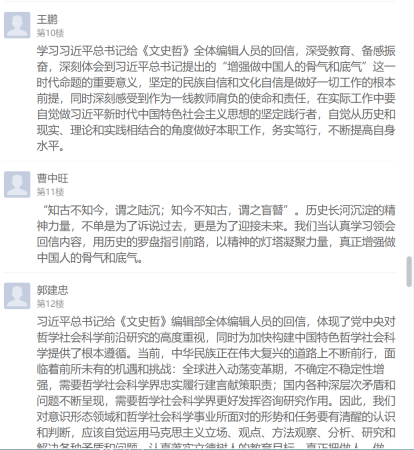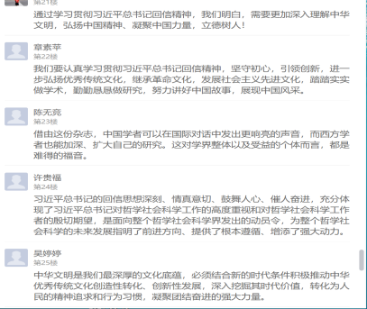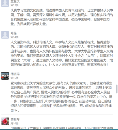 習(xí)近平總書記的回信在支部黨員中引起強(qiáng)烈反響,不僅在學(xué)習(xí)現(xiàn)場(chǎng)熱烈交流學(xué)習(xí)感想,還在線上學(xué)習(xí)通總支討論區(qū)紛紛留言發(fā)表心得體會(huì)。