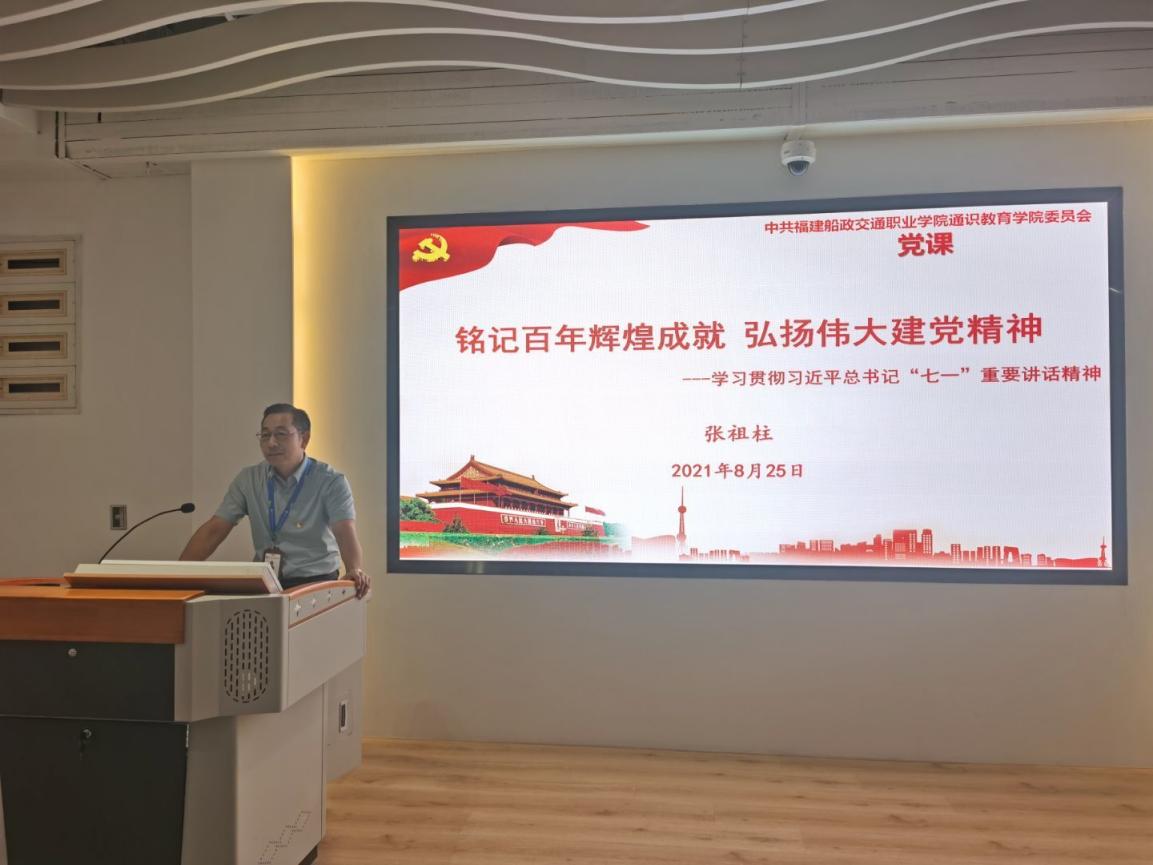 為深入學習貫徹習近平總書記在黨史學習教育動員大會、習近平總書記在慶祝中國共產(chǎn)黨成立100周年大會上的重要講話和來閩考察時重要講話指示精神,扎實推進黨史學習教育走深走實,8月25日上午,學院黨委委員、副院長張祖柱在學院黨建·思政·船政文化研學中心作題為《銘記百年輝煌成就,弘揚偉大建黨精神》黨史學習教育專題黨課,通識教育學院黨總支全體黨員參加。