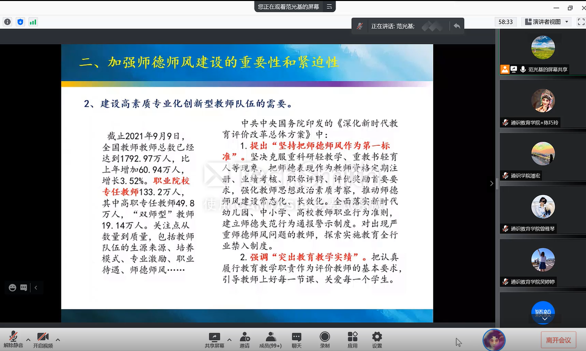 為進一步加強學(xué)院師德師風(fēng)建設(shè),實施“五個一”師德師風(fēng)建設(shè)機制,通識教育學(xué)院于近日邀請校外專家在線開展師德師風(fēng)專題培訓(xùn),通識教育學(xué)院全體教師和各二級學(xué)院部分教師參加培訓(xùn),本次培訓(xùn)由通識教育學(xué)院副院長金晶晶主持。