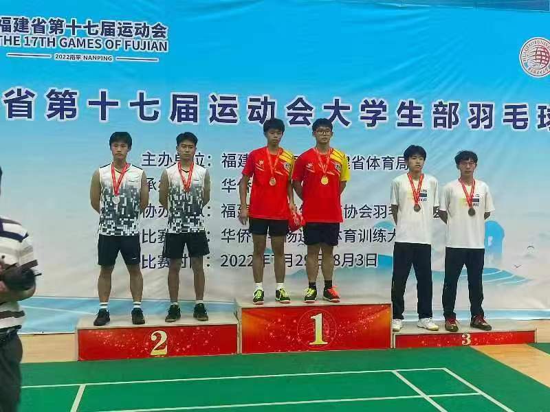2022年7月27日-8月3日,福建省第十七屆運(yùn)動(dòng)會(huì)(大學(xué)生部)羽毛球比賽在華僑大學(xué)泉州校區(qū)開賽,來(lái)自全省43所高校的353名運(yùn)動(dòng)員參賽。本次比賽包括男子單打、男子雙打、女子單打、女子雙打、男子團(tuán)體、女子團(tuán)體6個(gè)項(xiàng)目,我院羽毛球代表隊(duì)榮獲福建省第十七屆運(yùn)動(dòng)會(huì)(大學(xué)生部)羽毛球比賽丙組團(tuán)體總積分第一名的優(yōu)異成績(jī),并獲得“體育道德風(fēng)尚獎(jiǎng)運(yùn)動(dòng)隊(duì)”榮譽(yù)稱號(hào),運(yùn)動(dòng)員蔣賢智、楊舒淇獲個(gè)人“體育道德風(fēng)尚獎(jiǎng)”,王姍姍老師獲“優(yōu)秀教練員”榮譽(yù)稱號(hào)。