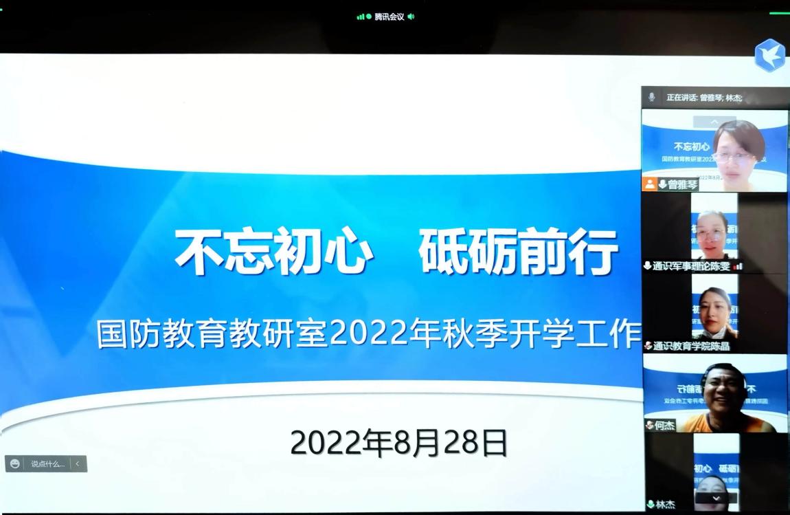 8月28日,國(guó)防教研室召開(kāi)2022年秋季開(kāi)學(xué)工作視頻會(huì)議,部署2022年秋季學(xué)期工作重點(diǎn)。