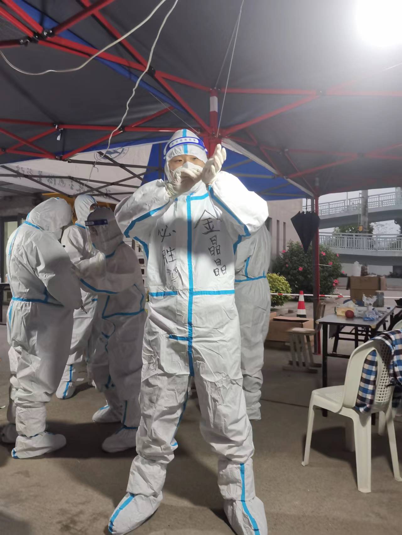 校園封閉管理期間,曾新平穿上防護服,化身“防護白”,聽從指揮,支援校內全員核酸檢測、學生宿舍管理等工作。從學生生活物資的配送,到核酸檢測掃碼,不辭辛苦,認真負責。曾新平說,“愿疫情早點結束,福州加油!船政加油!”