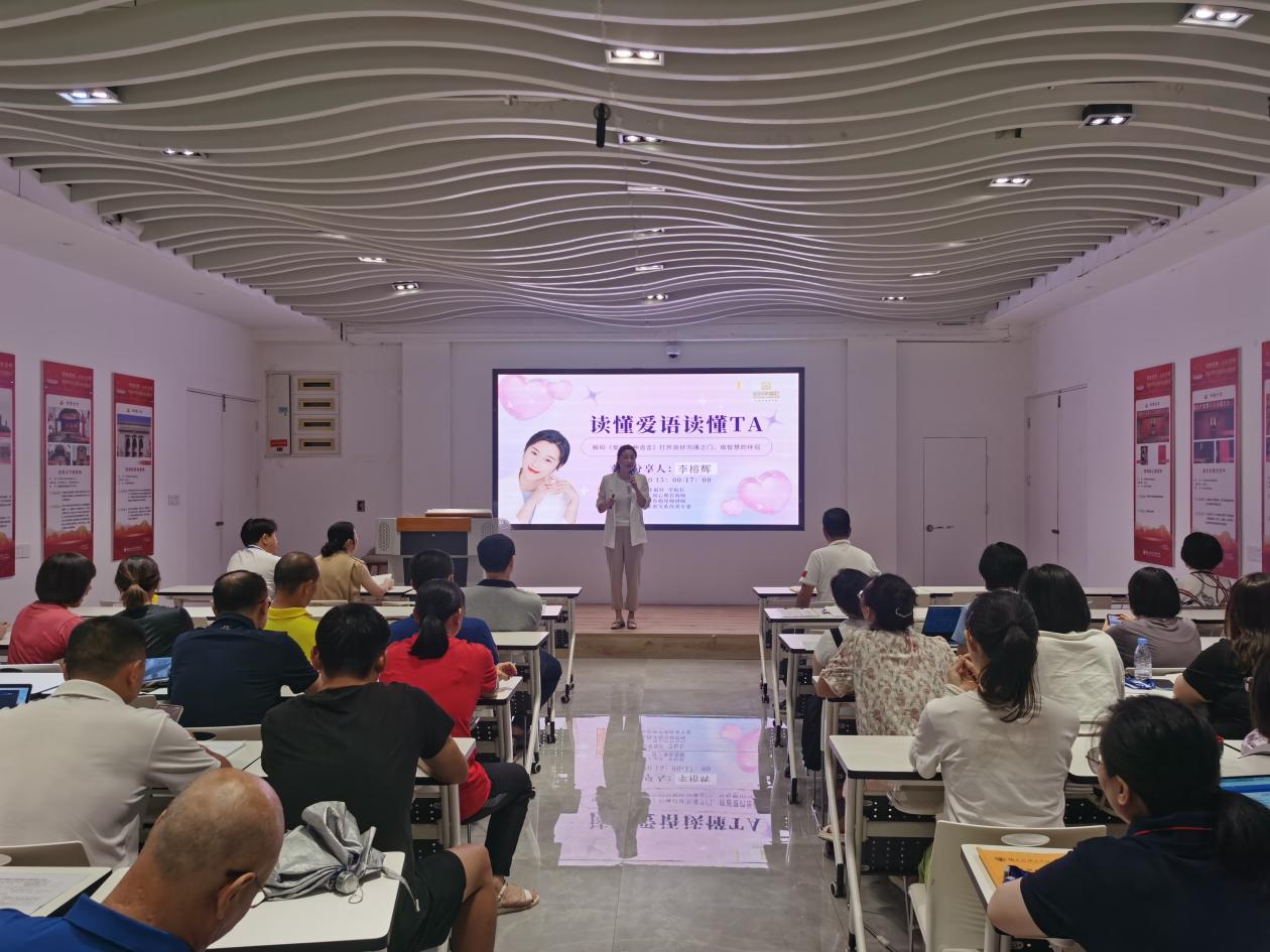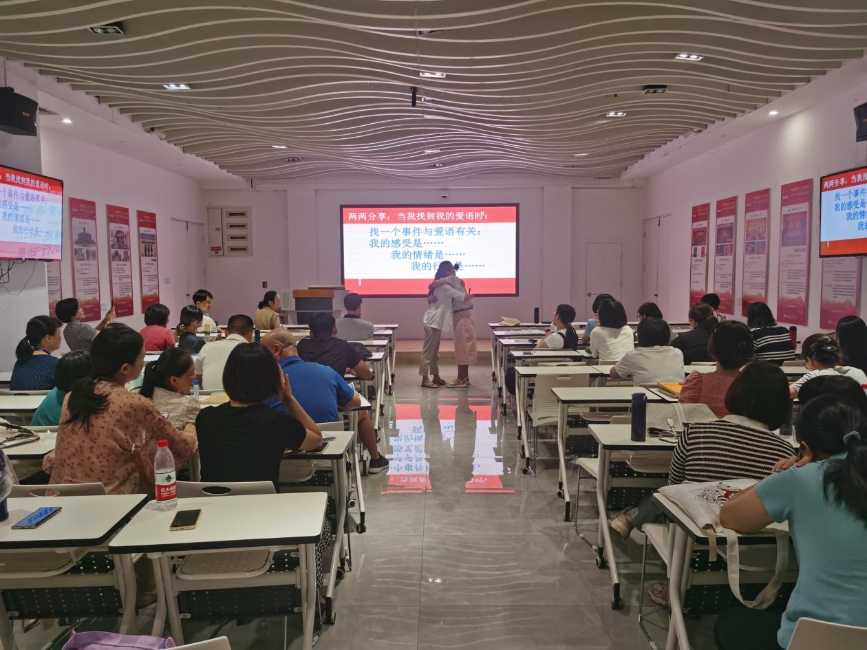 課上,李榕輝老師從教師心理健康出發(fā),結(jié)合生動的案例和自身經(jīng)歷,介紹家庭親子溝通的重要性、意義和途徑,重點(diǎn)闡述了肯定的言詞、精心的時刻、接受禮物、服務(wù)的行動和身體的接觸等“愛的五種語言”,以及具體表達(dá)方式。現(xiàn)場氣氛活躍,李榕輝開展多次互動游戲、測試、冥想母愛之光等活動,有效教師們打開良好溝通之門,提高與家人溝通的質(zhì)量。老師們紛紛表示,培訓(xùn)課氛圍感好,實(shí)用性強(qiáng),工作離不開家庭,離不開良好的親子關(guān)系,從培訓(xùn)課中學(xué)會了實(shí)用親子表達(dá)溝通的方式和技巧。