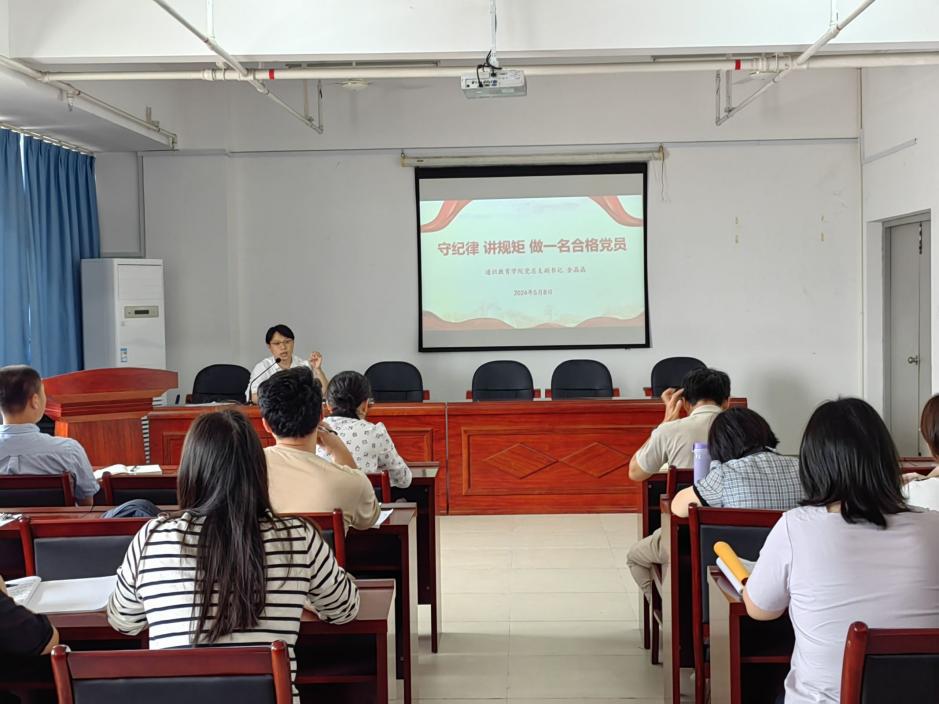 5月8日,通識教育學(xué)院黨總支副書記金晶晶以《守紀律 講規(guī)矩 做一名合格黨員》為題,對總支全體黨員、入黨積極分子上黨課。