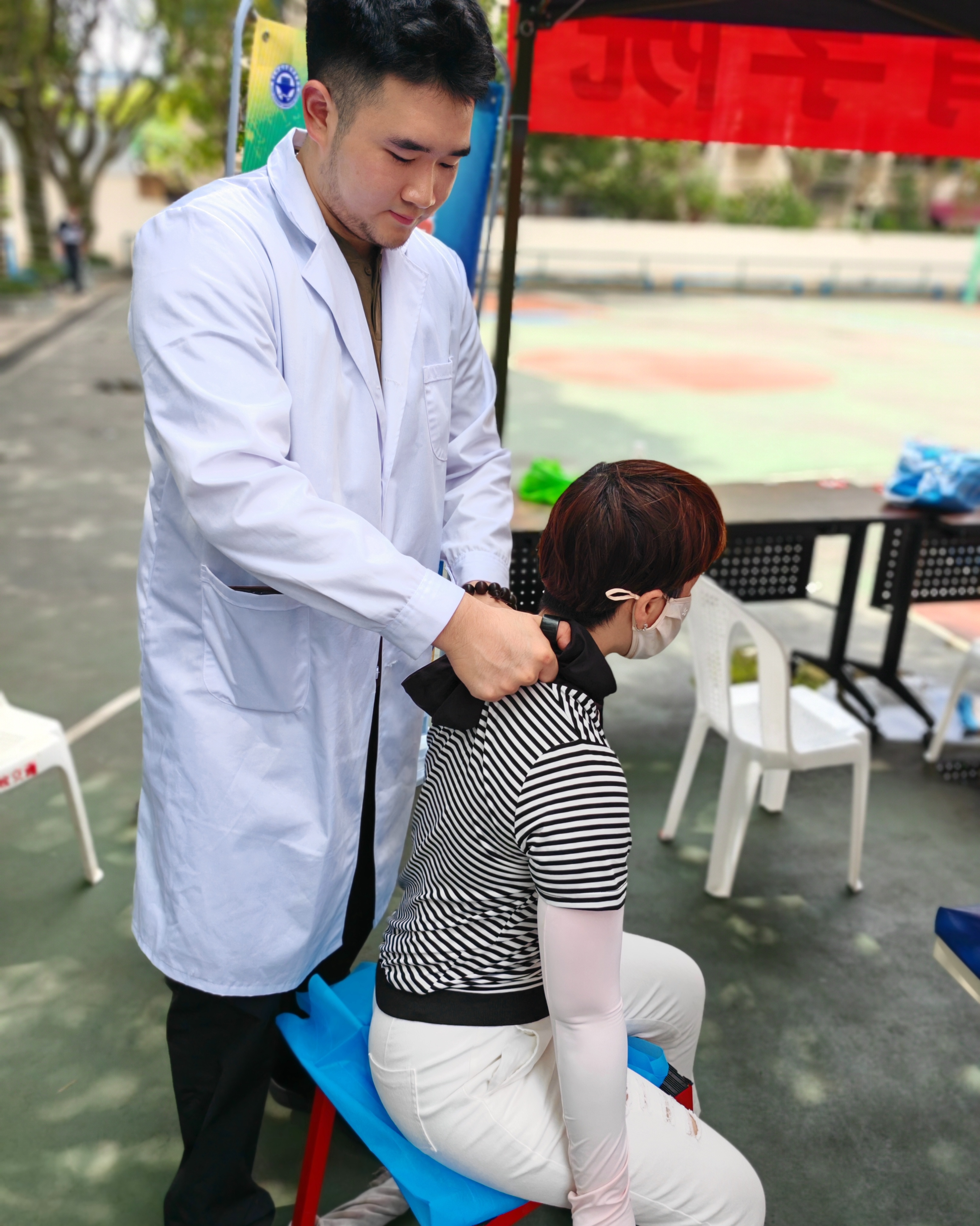 活動現(xiàn)場,學(xué)生團隊在教師指導(dǎo)下,為參觀者展示推拿、穴位按摩等中醫(yī)傳統(tǒng)康復(fù)技法,并重點針對運動中常見的腰椎間勞損問題,現(xiàn)場演示“評估-手法-養(yǎng)護”全流程解決方案。學(xué)生們結(jié)合人體經(jīng)絡(luò)模型,細致講解腰部穴位定位及保健手法,同時向長期久坐、運動愛好者等群體提出“科學(xué)熱身+核心肌群訓(xùn)練+日常姿勢管理”等針對性建議,受到廣泛好評。