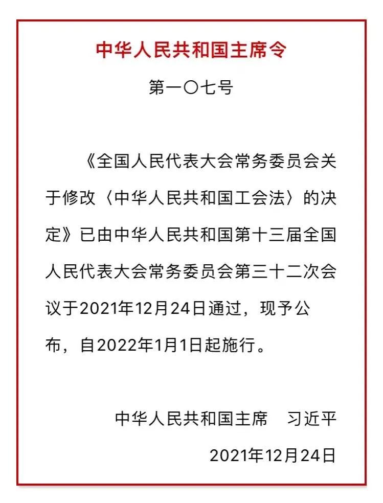 (1992年4月3日第七屆全國(guó)人民代表大會(huì)第五次會(huì)議通過 根據(jù)2001年10月27日第九屆全國(guó)人民代表大會(huì)常務(wù)委員會(huì)第二十四次會(huì)議《關(guān)于修改〈中華人民共和國(guó)工會(huì)法〉的決定》第一次修正 根據(jù)2009年8月27日第十一屆全國(guó)人民代表大會(huì)常務(wù)委員會(huì)第十次會(huì)議《關(guān)于修改部分法律的決定》第二次修正 根據(jù)2021年12月24日第十三屆全國(guó)人民代表大會(huì)常務(wù)委員會(huì)第三十二次會(huì)議《關(guān)于修改〈中華人民共和國(guó)工會(huì)法〉的決定》第三次修正)