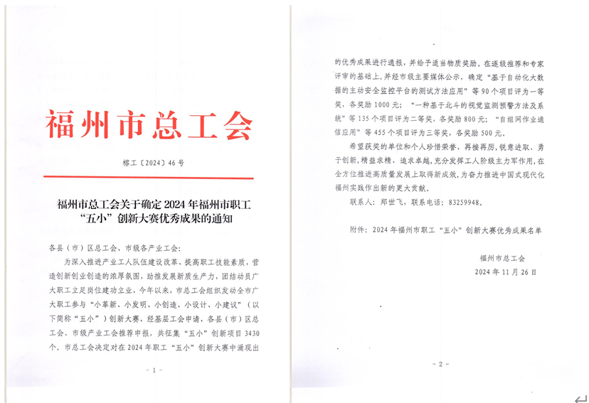 近日,福州市總工會(huì)公布《關(guān)于確定2024年福州市職工 “五小”創(chuàng)新大賽優(yōu)秀成果的通知》,我院鄒澤昌勞模和工匠人才創(chuàng)新工作室報(bào)送的創(chuàng)新成果榮獲一等獎(jiǎng)2項(xiàng)、二等獎(jiǎng)1項(xiàng)、三等獎(jiǎng)2項(xiàng)。