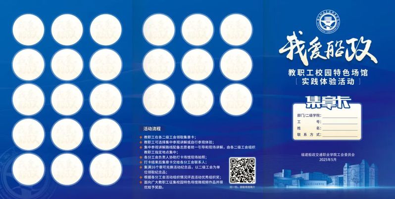 活動以“創(chuàng)新船政、質(zhì)量船政、文化船政、開放船政”理念為牽總,學(xué)院校史館、三全育人館、嚴(yán)復(fù)史績館、黨建思政船政文化研學(xué)中心“三館一中心”為組團(tuán),青年服務(wù)中心、“一站式”學(xué)生服務(wù)中心、職工之家“兩區(qū)三陣地”為輻射,航海技術(shù)、安全技術(shù)與管理兩大“雙高”專業(yè)群為龍頭,交通土建、汽車運用、通用航空、軌道交通、交通運輸服務(wù)、機(jī)械與智能制造、信息技術(shù)與智慧交通為支撐的9大現(xiàn)代綜合立體交通專業(yè)集群16個特色實驗實訓(xùn)基地為延伸,采用集章打卡互動形式,通過沉浸式、體驗式參觀方式,教學(xué)相長、組團(tuán)互學(xué)研學(xué)實踐,充分活化學(xué)院“愛國強(qiáng)技、產(chǎn)學(xué)一體、精益求精、趨變求新”職教資源和辦學(xué)特色,充分激發(fā)學(xué)院教職工的自豪感、幸福感和獲得感,團(tuán)結(jié)引領(lǐng)廣大教職員工與學(xué)院發(fā)展同頻共振,與偉大時代進(jìn)步同向同行。