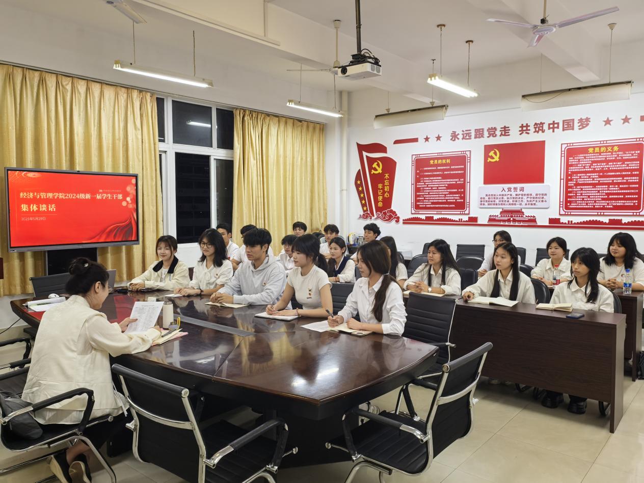 5月29日,經(jīng)濟(jì)與管理學(xué)院召開2024級新一屆學(xué)生干部集體談話會(huì)。學(xué)院黨總支書記陳慧、學(xué)院團(tuán)委書記傅一丹及全體新任學(xué)生干部參加了會(huì)議。