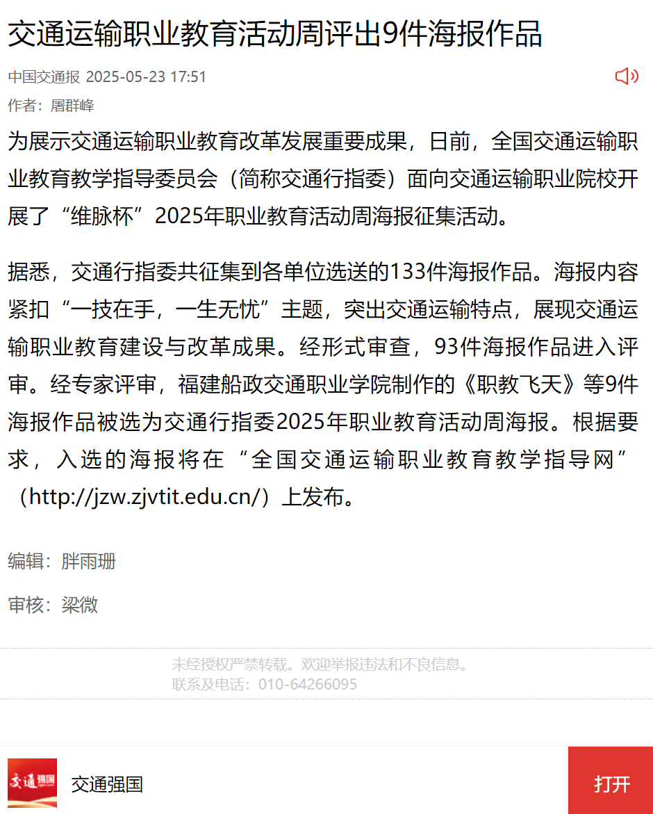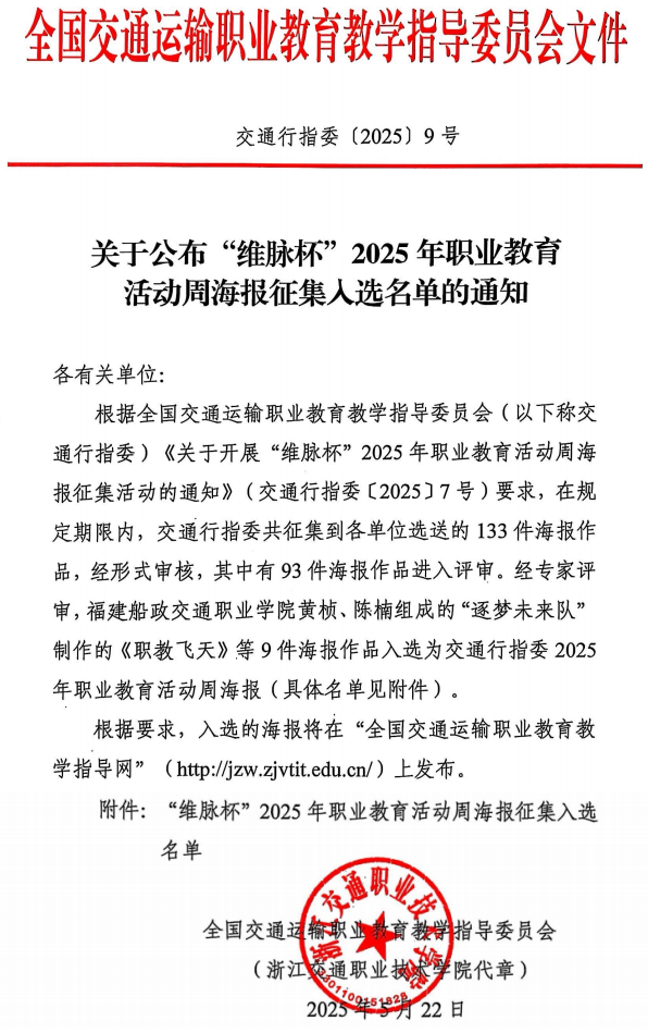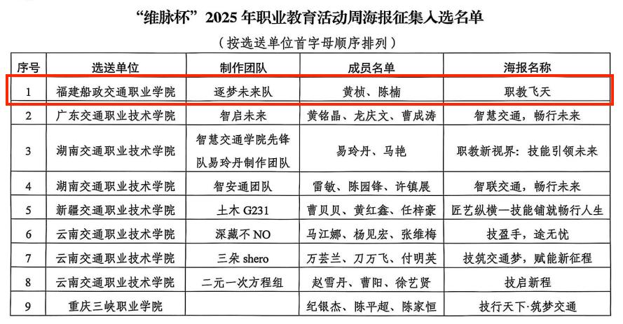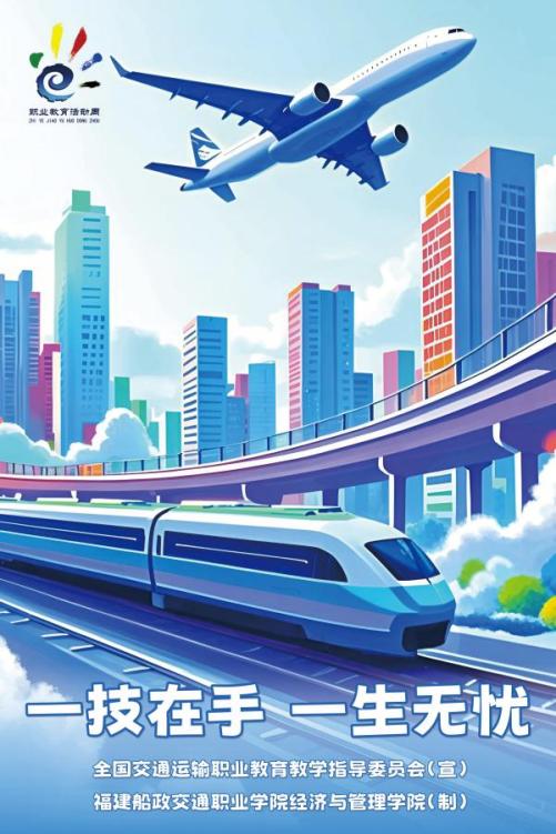 近期,全國(guó)交通運(yùn)輸職業(yè)教育教學(xué)指導(dǎo)委員會(huì)(以下稱(chēng)交通行指委)正式公布了2025年職業(yè)教育活動(dòng)周海報(bào)征集結(jié)果,由經(jīng)濟(jì)與管理學(xué)院黃楨、陳楠兩名同學(xué)組成的“逐夢(mèng)未來(lái)隊(duì)”(指導(dǎo)老師官源)提交的作品從全國(guó)133件投稿中脫穎而出,成功入選!此次活動(dòng)僅有9件海報(bào)作品入選為交通行指委2025年職業(yè)教育活動(dòng)周海報(bào),入選的海報(bào)作品將在“全國(guó)交通運(yùn)輸職業(yè)教育教學(xué)指導(dǎo)網(wǎng)”上發(fā)布。