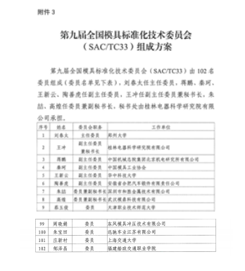 8月30日,國家標(biāo)準(zhǔn)化管理委員會公告(2023年第9號)批準(zhǔn)了全國模具標(biāo)準(zhǔn)化技術(shù)委員會換屆。我院鄒澤昌老師入選第九屆全國模具標(biāo)準(zhǔn)化技術(shù)委員會(SAC/TC33)委員。全國模具標(biāo)準(zhǔn)化技術(shù)委員會是國家標(biāo)準(zhǔn)化管理委員會直屬的全國性標(biāo)準(zhǔn)化技術(shù)組織,成立于1983年,主要負(fù)責(zé)模具領(lǐng)域國家標(biāo)準(zhǔn)和行業(yè)標(biāo)準(zhǔn)的制修訂工作。