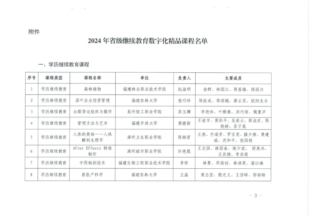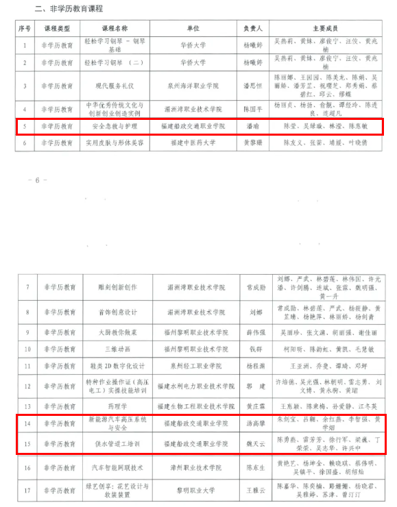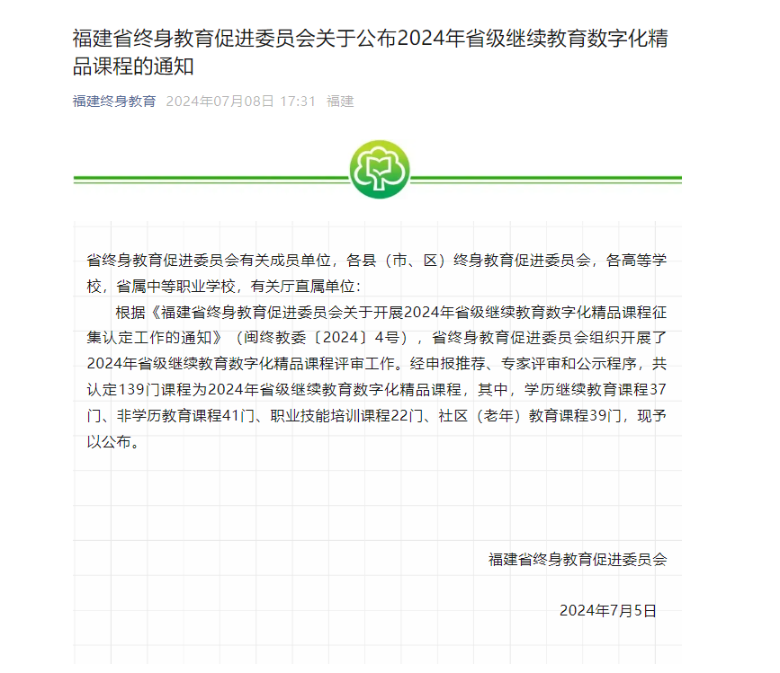 近日,福建省終身教育促進委員會公布《2024年省級繼續(xù)教育數(shù)字化精品課程》,共認定139門課程為2024年省級繼續(xù)教育數(shù)字化精品課程,其中,學歷繼續(xù)教育課程37門、非學歷教育課程41門、職業(yè)技能培訓課程22門、社區(qū)(老年)教育課程39門。我校非學歷教育課程《安全急救與護理》《新能源汽車高壓系統(tǒng)與安全》《供水管道工培訓》、社區(qū)(老年)教育課程《晚年出行新模式》共四門課程成功入選。
