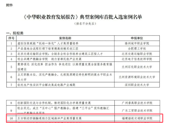 近日,由中華職業(yè)教育社編撰、社會科學文獻出版社出版的《中華職業(yè)教育發(fā)展報告(2023-2024)》在京發(fā)布,我院報送的《五方聯動四鏈融通助力區(qū)域海洋產業(yè)高質量發(fā)展》成功入選《中華職業(yè)教育發(fā)展報告》典型案例庫首批入選案例名單。