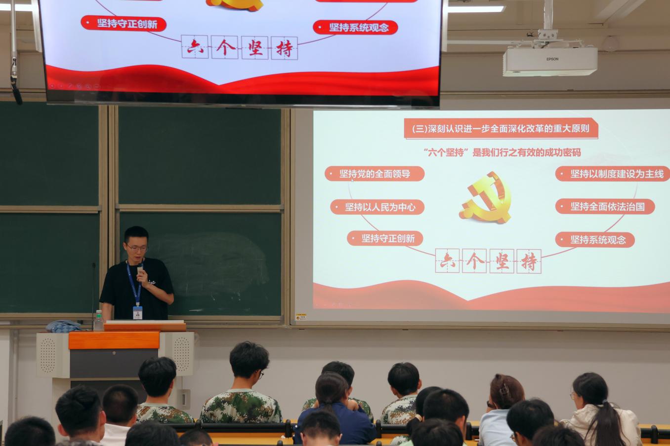 施文老師主要圍繞“黨的二十屆三中全會精神”為主題宣講,通過深入闡述黨的二十屆三中全會的豐富內(nèi)涵、重要意義、實踐要求等三個方面,進一步帶領(lǐng)廣大青年學(xué)子了解黨的二十屆三中全會的歷史意義、現(xiàn)實意義、理論意義,激勵同學(xué)們奮發(fā)篤行,將個人的青春夢想融入實現(xiàn)中華民族偉大復(fù)興的中國夢之中,不負韶華,不負時代,以實際行動書寫無愧于黨和人民的青春華章,爭做德智體美勞全面發(fā)展的社會主義建設(shè)者和接班人。