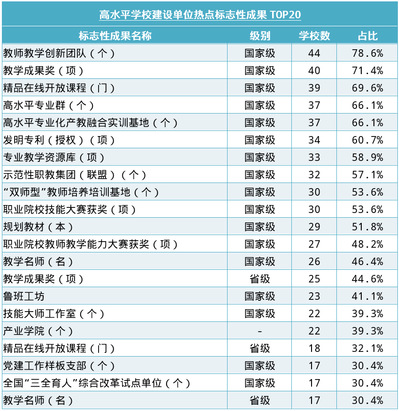 從統(tǒng)計(jì)數(shù)據(jù)來(lái)看,國(guó)家級(jí)教師教學(xué)創(chuàng)新團(tuán)隊(duì)成為“雙高計(jì)劃”56所高水平學(xué)校建設(shè)單位標(biāo)志性成果最熱詞匯,44所院校(78.6%)均將建設(shè)國(guó)家級(jí)教師教學(xué)創(chuàng)新團(tuán)隊(duì)列為標(biāo)志性成果;其次是國(guó)家教學(xué)成果獎(jiǎng)、國(guó)家精品在線開(kāi)放課程、國(guó)家高水平專(zhuān)業(yè)群、國(guó)家高水平專(zhuān)業(yè)化產(chǎn)教融合實(shí)訓(xùn)基地,分列第2至第5位,超過(guò)60%的院校標(biāo)志性成果中涵蓋了這些指標(biāo)。