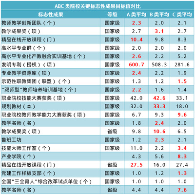 ABC三類(lèi)院校關(guān)鍵標(biāo)志性成果目標(biāo)設(shè)置對(duì)比: