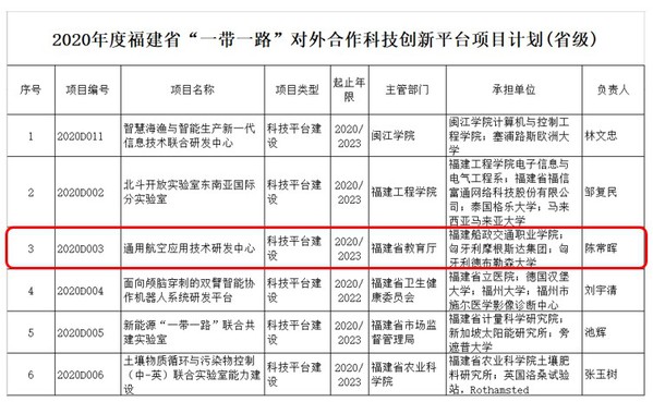 福建省科學(xué)技術(shù)廳近日發(fā)文,由福建船政交通職業(yè)學(xué)院與摩根斯達(dá)集、匈牙利德布勒森大學(xué)共同建設(shè)的“通用航空應(yīng)用技術(shù)研發(fā)中心”列入2020年度福建省“一帶一路”對(duì)外合作科技創(chuàng)新平臺(tái)項(xiàng)目計(jì)劃(省級(jí))。