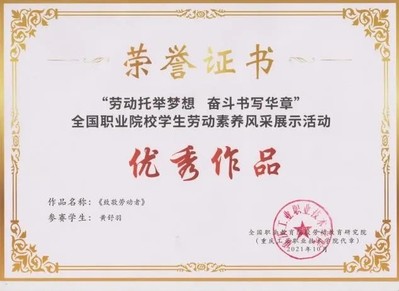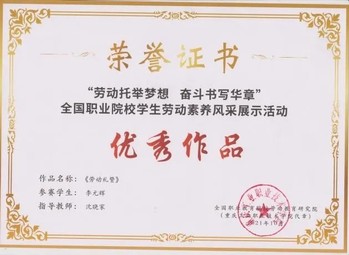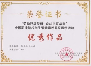 根據(jù)全國(guó)職業(yè)院校勞動(dòng)教育研究院主辦的第一屆全國(guó)職業(yè)院校學(xué)生勞動(dòng)素養(yǎng)風(fēng)采展示活動(dòng)通知要求,我院積極響應(yīng),在全院范圍進(jìn)行了廣泛的宣傳,組織開展了以“勞動(dòng)最美麗奮斗最幸福”為主題的系列教育活動(dòng),動(dòng)員學(xué)生踴躍參與活動(dòng)。學(xué)院對(duì)評(píng)審后的優(yōu)秀作品上報(bào)至全國(guó)職業(yè)院校勞動(dòng)教育研究院進(jìn)行參評(píng)。4個(gè)作品獲獎(jiǎng),參賽作品充分表現(xiàn)了我院學(xué)子的勤儉、奮斗、創(chuàng)新、奉獻(xiàn)的勞動(dòng)精神。