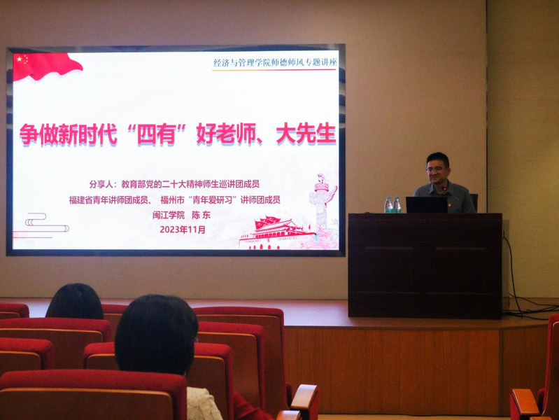 為深入貫徹落實(shí)黨的二十大精神,引導(dǎo)廣大教職工堅(jiān)定理想信念、陶冶道德情操、涵養(yǎng)扎實(shí)學(xué)識、勤修仁愛之心,進(jìn)一步發(fā)揮教師的積極性、主動(dòng)性、創(chuàng)造性,全面落實(shí)立德樹人根本任務(wù),2023年11月8日,經(jīng)濟(jì)與管理學(xué)院舉辦了2023年師德師風(fēng)專題講座,特邀全國模范教師陳東作《爭做新時(shí)代“四有”好老師、大先生》專題報(bào)告。