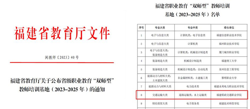 7月12日,福建省教育廳印發(fā)《關(guān)于公布省級職業(yè)教育“雙師型”教師培訓(xùn)基地(2023-2025年)的通知》,我校依托航海技術(shù)高水平專業(yè)群,獲批福建省職業(yè)教育“雙師型”教師培訓(xùn)基地(2023-2025年),開展水上運(yùn)輸類的“雙師型”教師培訓(xùn)與實(shí)踐。福建省職業(yè)教育“雙師型”教師培訓(xùn)基地是我省職業(yè)院校教師發(fā)展體系的重要組成部分,是承擔(dān)省級及以上職業(yè)院校教師素質(zhì)提高計(jì)劃培訓(xùn)任務(wù)的重要載體。
