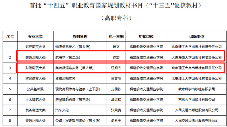6月30日,教育部公布了首批“十四五”職業(yè)教育國(guó)家規(guī)劃教材書(shū)目,根據(jù)《“十四五”職業(yè)教育規(guī)劃教材建設(shè)實(shí)施方案》和《教育部辦公廳關(guān)于組織開(kāi)展“十四五”首批職業(yè)教育國(guó)家規(guī)劃教材遴選工作的通知》要求,經(jīng)有關(guān)單位申報(bào)、形式審查、專(zhuān)家評(píng)審、專(zhuān)項(xiàng)審核、專(zhuān)家復(fù)核、面向社會(huì)公示等程序,共確定7251種教材入選首批“十四五”職業(yè)教育國(guó)家規(guī)劃教材(以下簡(jiǎn)稱(chēng)“十四五”國(guó)規(guī)教材),涵蓋全部19個(gè)專(zhuān)業(yè)大類(lèi)、1382個(gè)專(zhuān)業(yè)。航海技術(shù)專(zhuān)業(yè)群入選三本,其中新申報(bào)入選1本,“十三五”復(fù)核教材入選兩本。