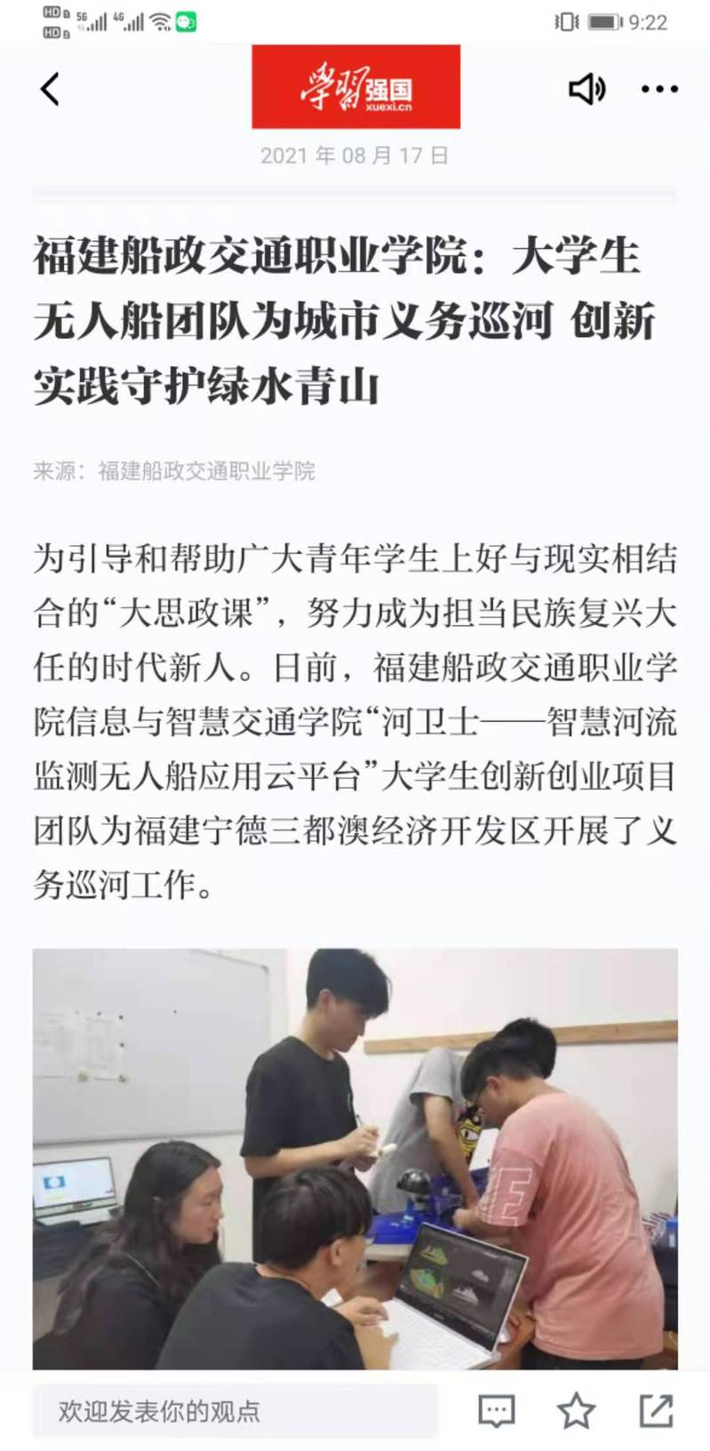 為引導(dǎo)和幫助廣大青年學(xué)生上好與現(xiàn)實相結(jié)合的“大思政課”,努力成為擔(dān)當(dāng)民族復(fù)興大任的時代新人。日前,福建船政交通職業(yè)學(xué)院信息與智慧交通學(xué)院“河衛(wèi)士——智慧河流監(jiān)測無人船應(yīng)用云平臺”大學(xué)生創(chuàng)新創(chuàng)業(yè)項目團隊為福建寧德三都澳經(jīng)濟開發(fā)區(qū)開展了義務(wù)巡河工作。