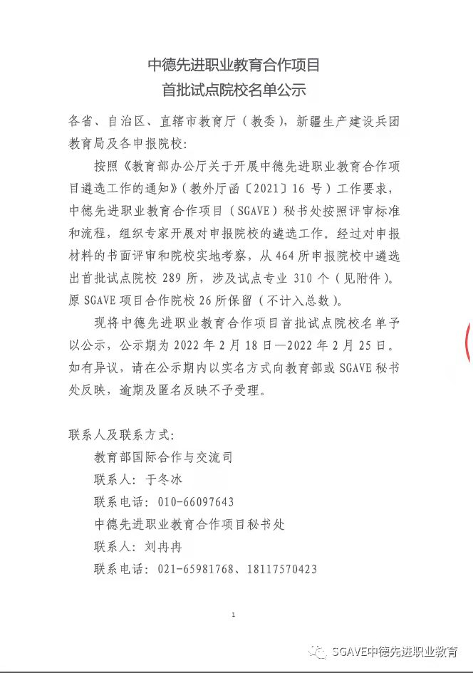 中德先進(jìn)職業(yè)教育合作項(xiàng)目(簡稱SGAVE項(xiàng)目)是教育部與德國等歐洲職業(yè)教育模式先進(jìn)國家行業(yè)龍頭企業(yè)聯(lián)合實(shí)施的職業(yè)教育合作項(xiàng)目。該項(xiàng)目深化產(chǎn)教融合、校企合作,深入推進(jìn)育人方式、辦學(xué)模式、管理體制、保障機(jī)制改革,借鑒“雙元制”辦學(xué)模式,推動(dòng)建設(shè)具有國際先進(jìn)水平的中國特色職業(yè)教育體系。