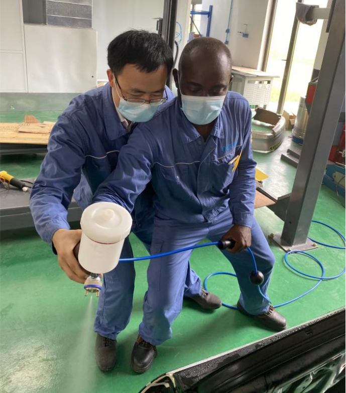 圖2 加蓬團隊手把手教非洲學(xué)員練習噴漆