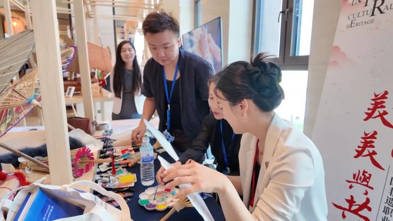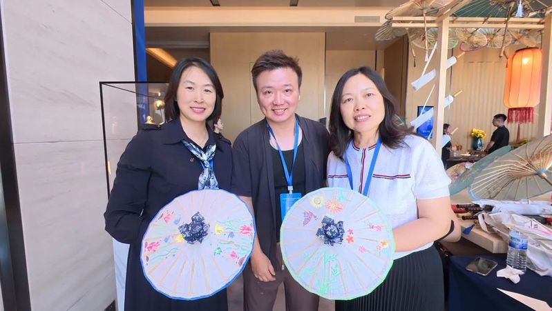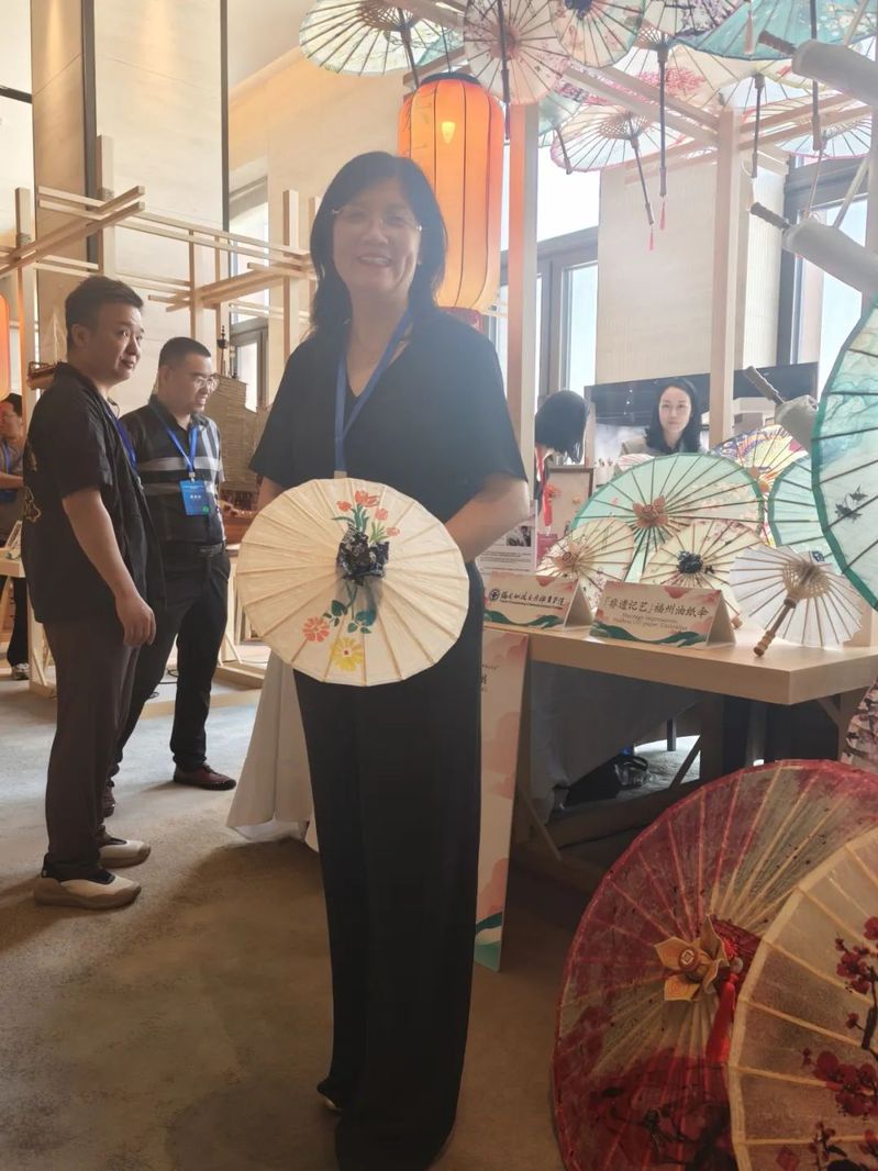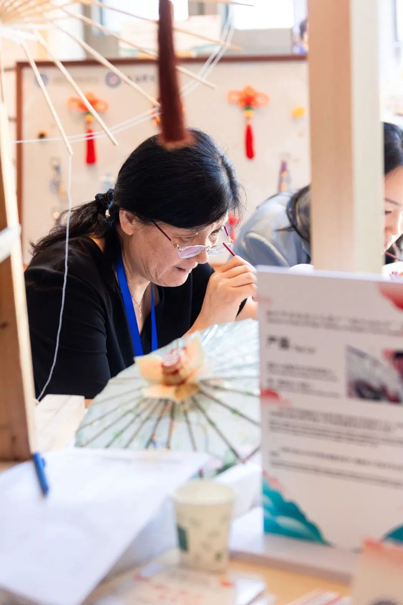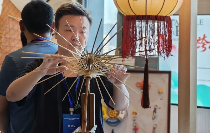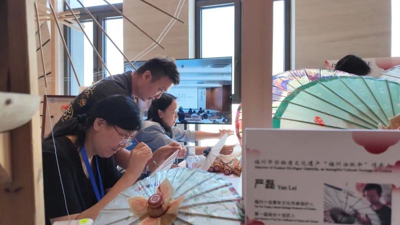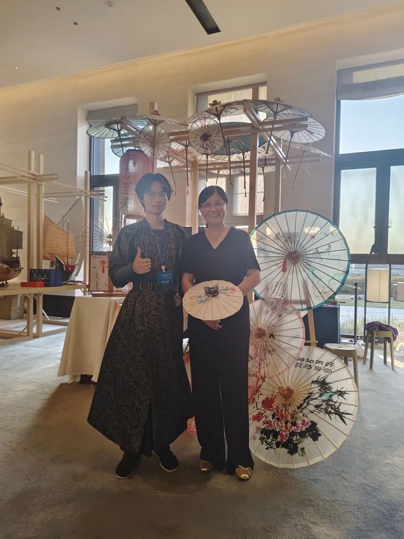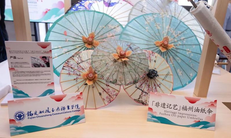 會議期間同步舉辦了“跨越山海 美美與共”中國非遺職業(yè)教育成果巡展之“非遺記藝”文化藝術交流展。我院非遺傳習社指導教師、通識教育學院教師林丹青與我院特聘非遺傳承人嚴磊帶領社團成員攜福建省第六批省級非物質(zhì)文化遺產(chǎn)代表性項目——福州油紙傘制作技藝精彩亮相,成為展會上一道亮麗風景,向世界展示了我院在非遺傳承與職業(yè)教育融合創(chuàng)新中的豐碩成果。